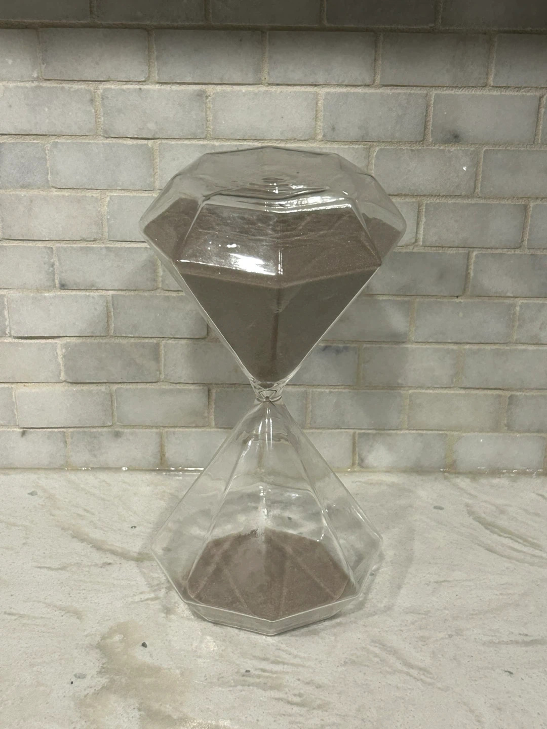 This hourglass sand timer is shaped like a diamond. Its unique design makes it a neat decorative piece. It's useful for timing short activities or as a conversation starter!