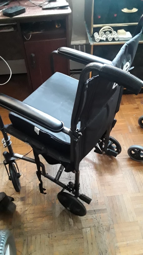 Black transport wheelchair. Features include padded seat and backrest, flip-back armrests, and lightweight frame. Comfortable and in great condition.