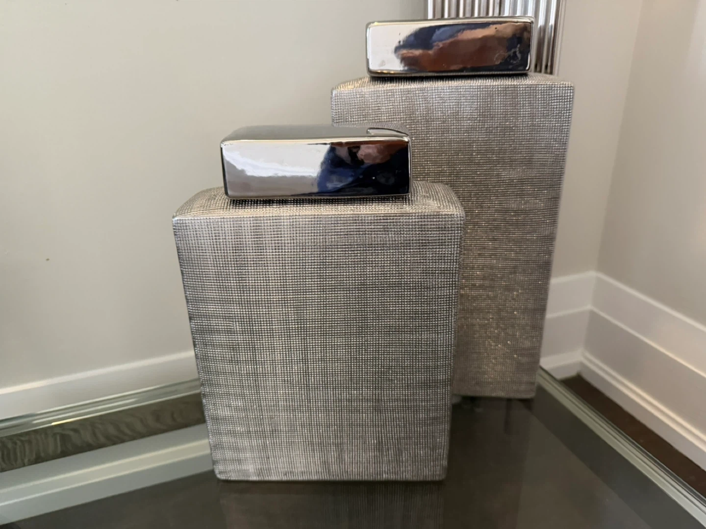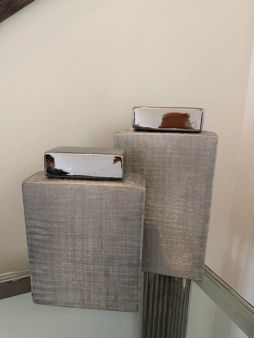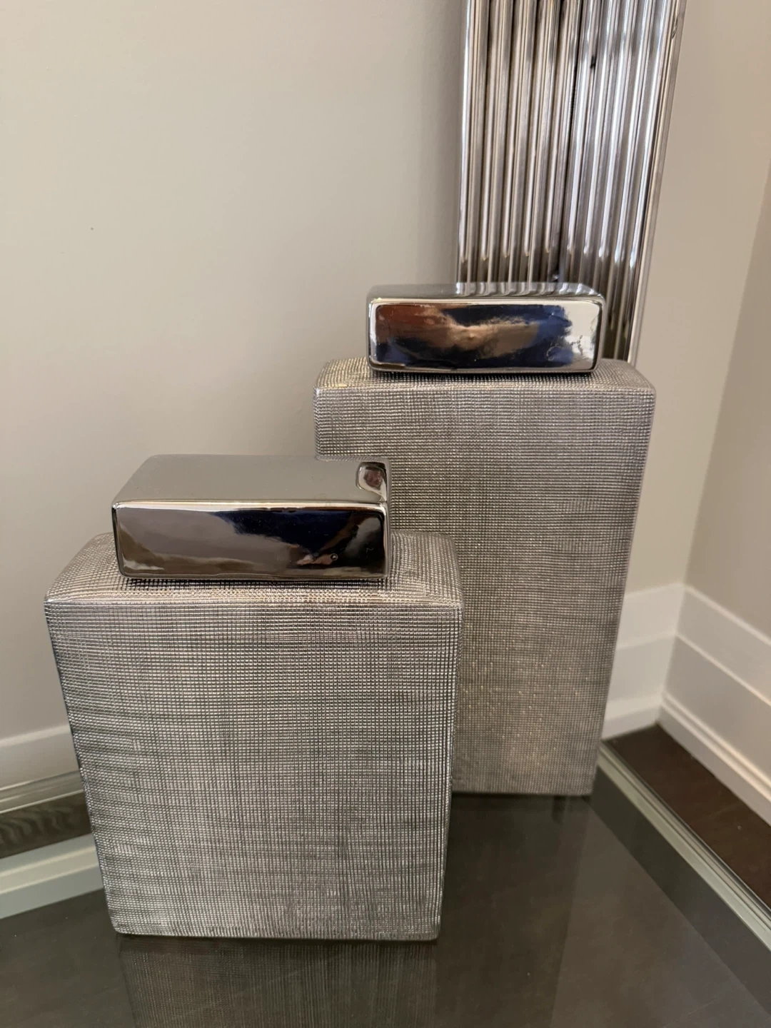 Set of two decorative pedestals with silver textured finish and shiny chrome-look tops. These pedestals add a touch of modern elegance to any space. They're perfect for displaying sculptures or plants.