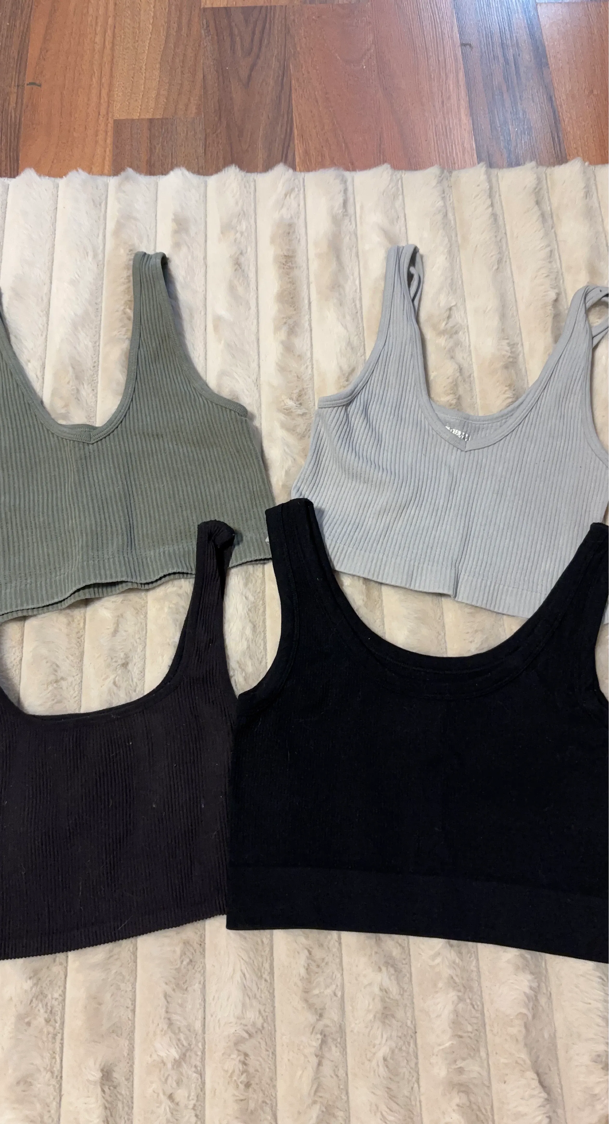 A set of four ribbed tank tops, including two black, one grey, and one green. They're made of a comfortable, stretchy material. These are perfect for layering or wearing on their own!