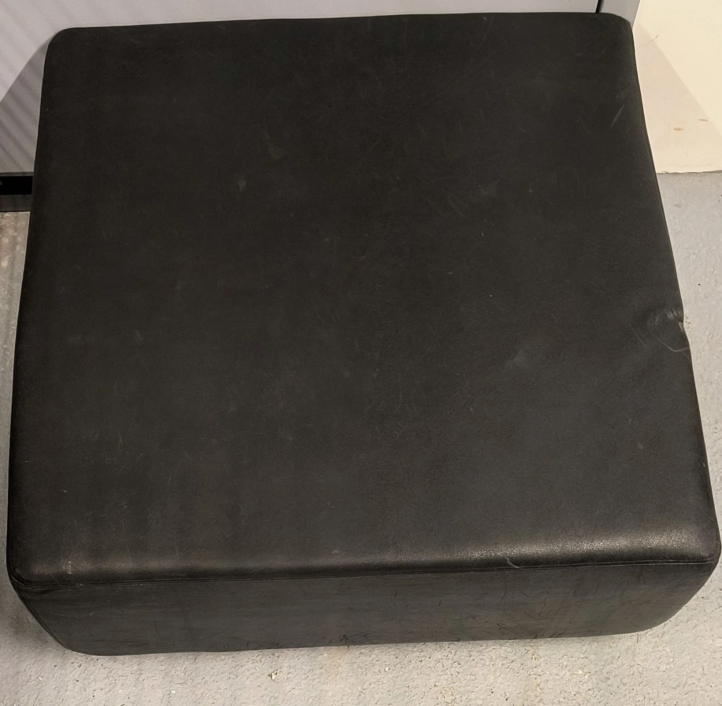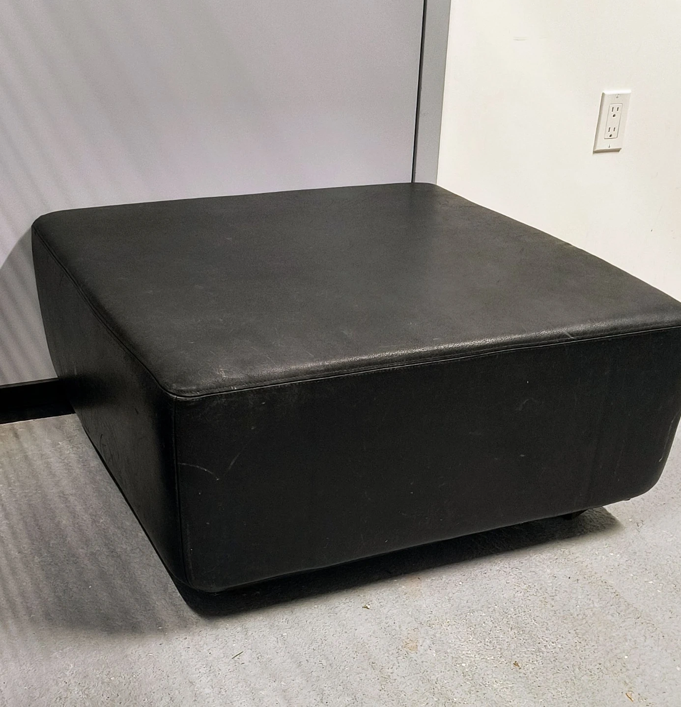 A versatile black leather ottoman. It's upholstered in what appears to be leather. This ottoman can serve as a footrest or extra seating. Its simple design fits many decors.