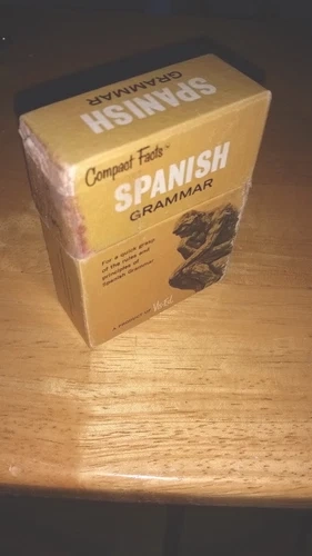 Up for grabs is a vintage box of Compact Facts Spanish Grammar cards. This set includes 60 cards and is a product of Vis-Ed, manufactured in Dayton, Ohio. One of the cards is dated 1963. The outer box has some minor damage on one side, but it's in good shape for its age. Let me know if you're interested!