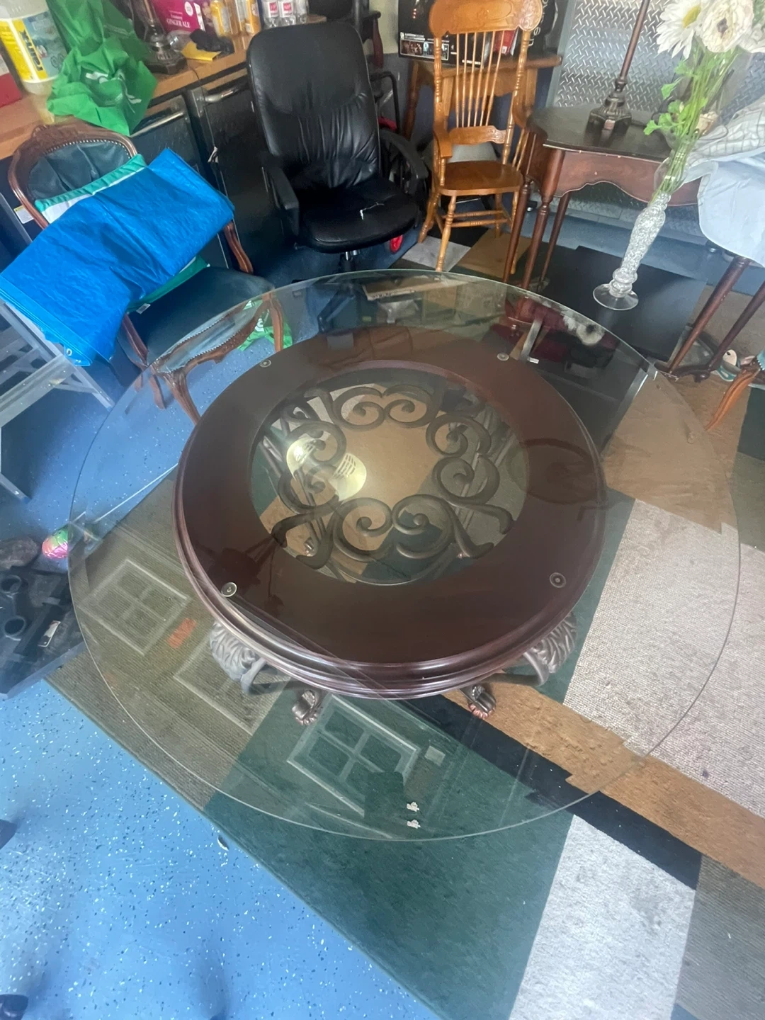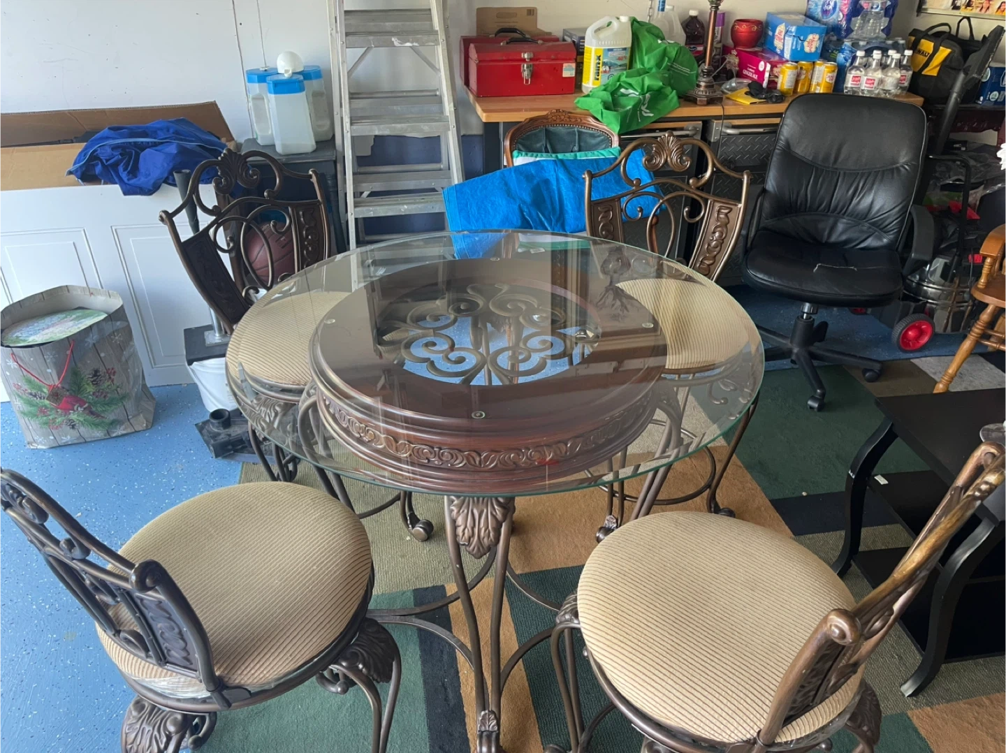 Selling a beautiful round dining table with a glass top and four matching chairs. The table features a decorative, ornate base and the chairs have upholstered seats. It's a great set for a smaller dining space or kitchen nook!