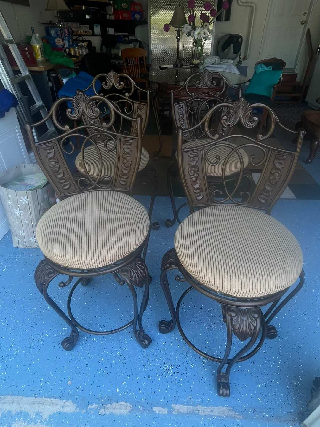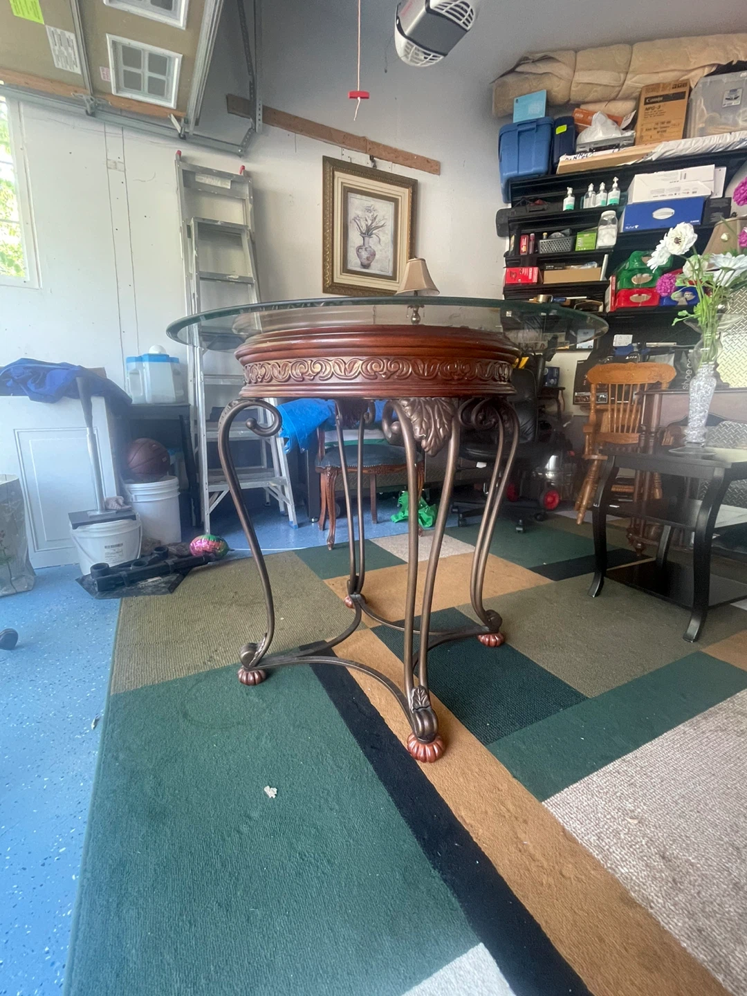 Selling a beautiful round dining table with a glass top and four matching chairs. The table features a decorative, ornate base and the chairs have upholstered seats. It's a great set for a smaller dining space or kitchen nook!