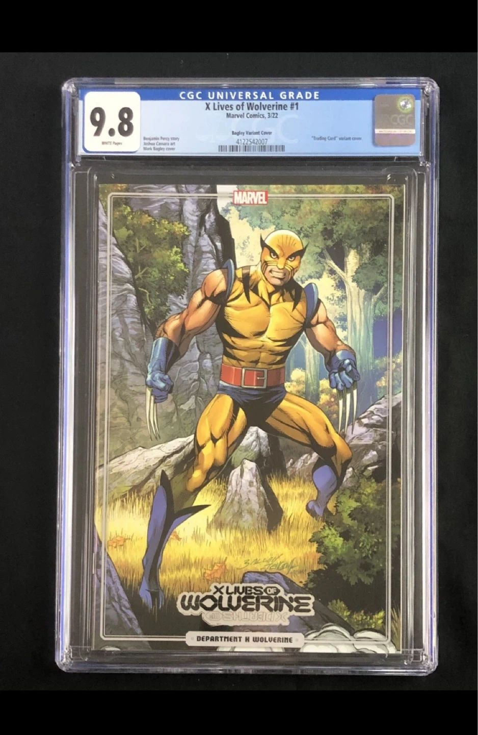 The X-Lives of Wolverine #1 CGC 9.8 Marvel 2022 Bagley Trading Card Variant is a highly sought-after comic book featuring Wolverine (Logan) from the X-Men superhero team. This single issue variant cover by Mark Bagley, with a story by Benjamin Percy, is part of the X-Lives of Wolverine series published by Marvel Comics. With a modern age era and action-packed genre, this comic is a must-have for collectors and fans of the Marvel Universe.