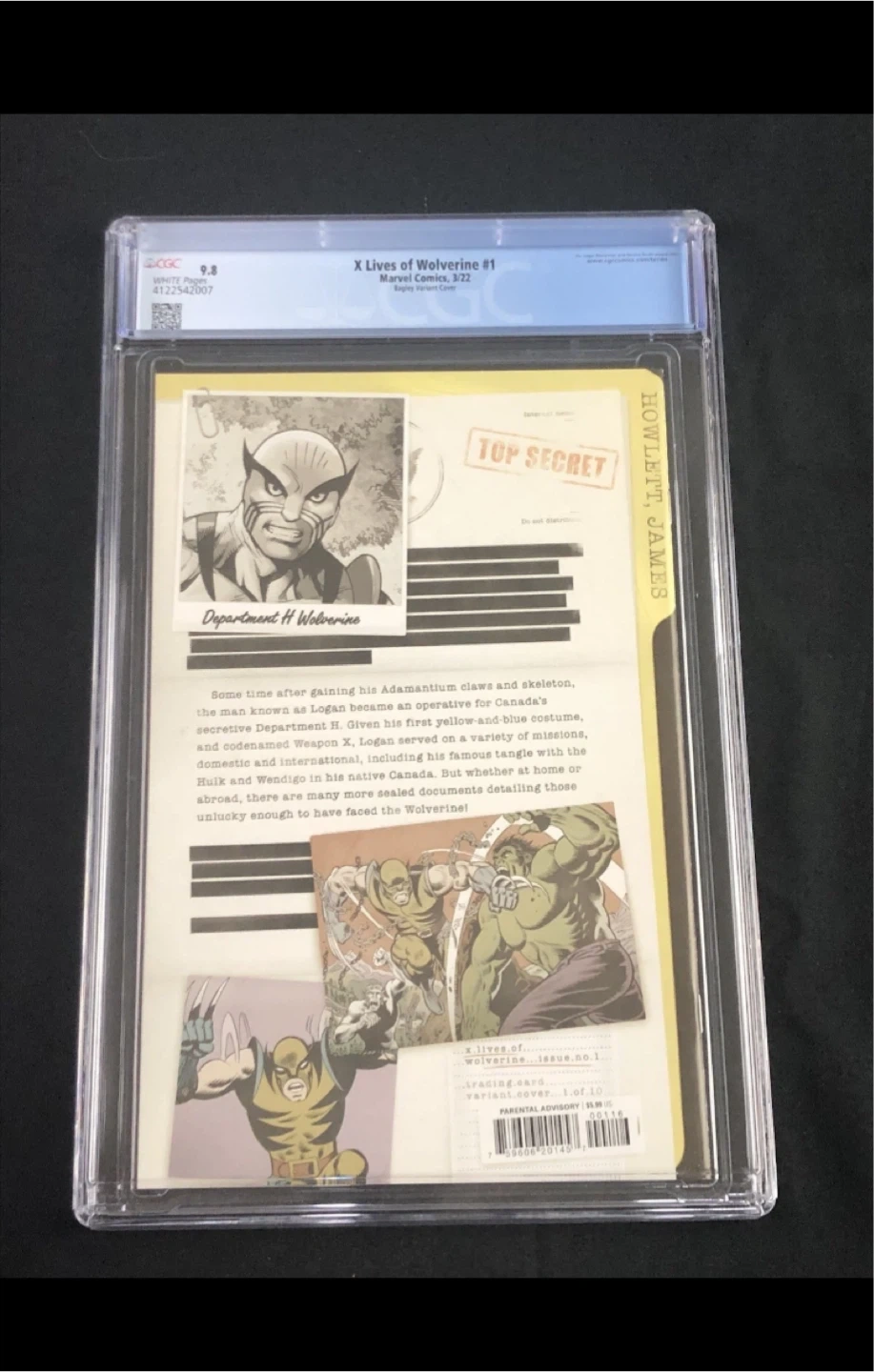 The X-Lives of Wolverine #1 CGC 9.8 Marvel 2022 Bagley Trading Card Variant is a highly sought-after comic book featuring Wolverine (Logan) from the X-Men superhero team. This single issue variant cover by Mark Bagley, with a story by Benjamin Percy, is part of the X-Lives of Wolverine series published by Marvel Comics. With a modern age era and action-packed genre, this comic is a must-have for collectors and fans of the Marvel Universe.