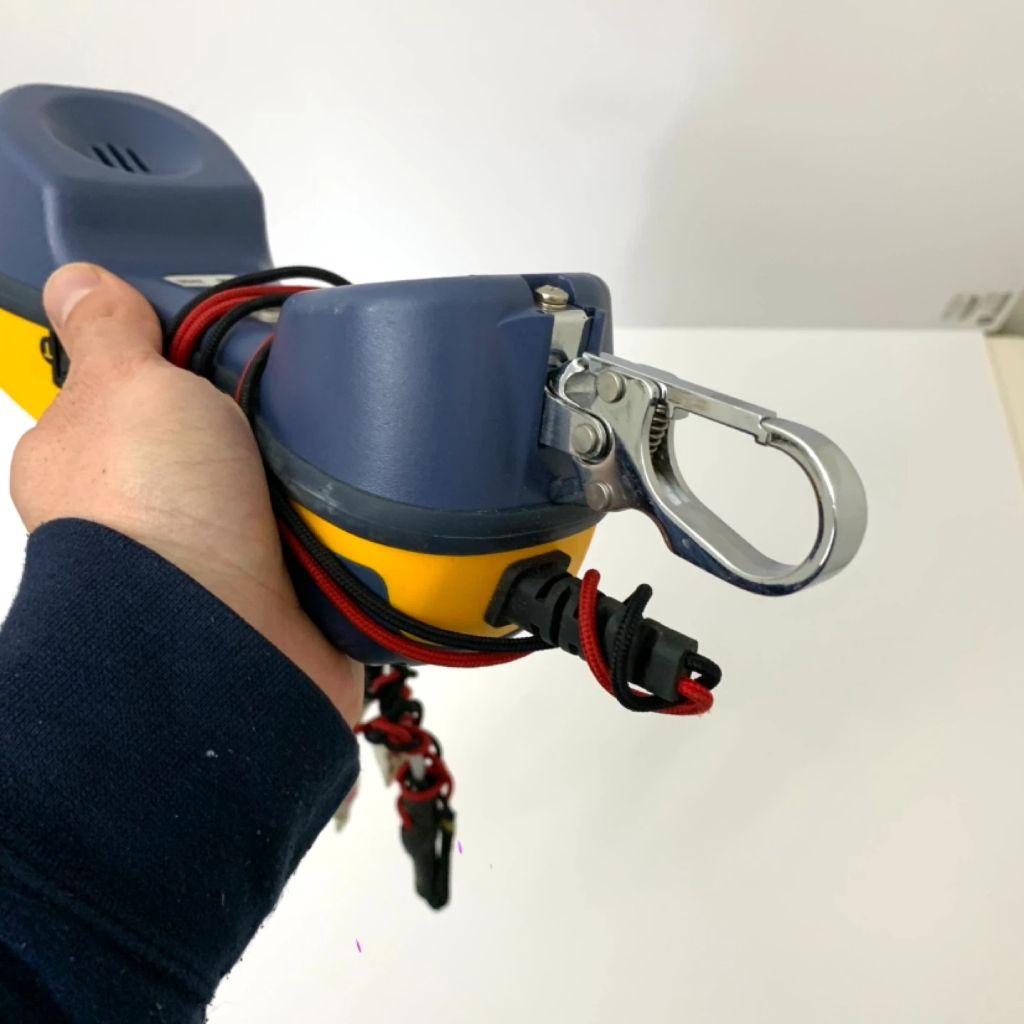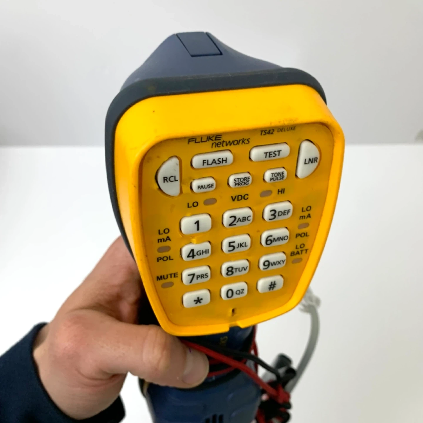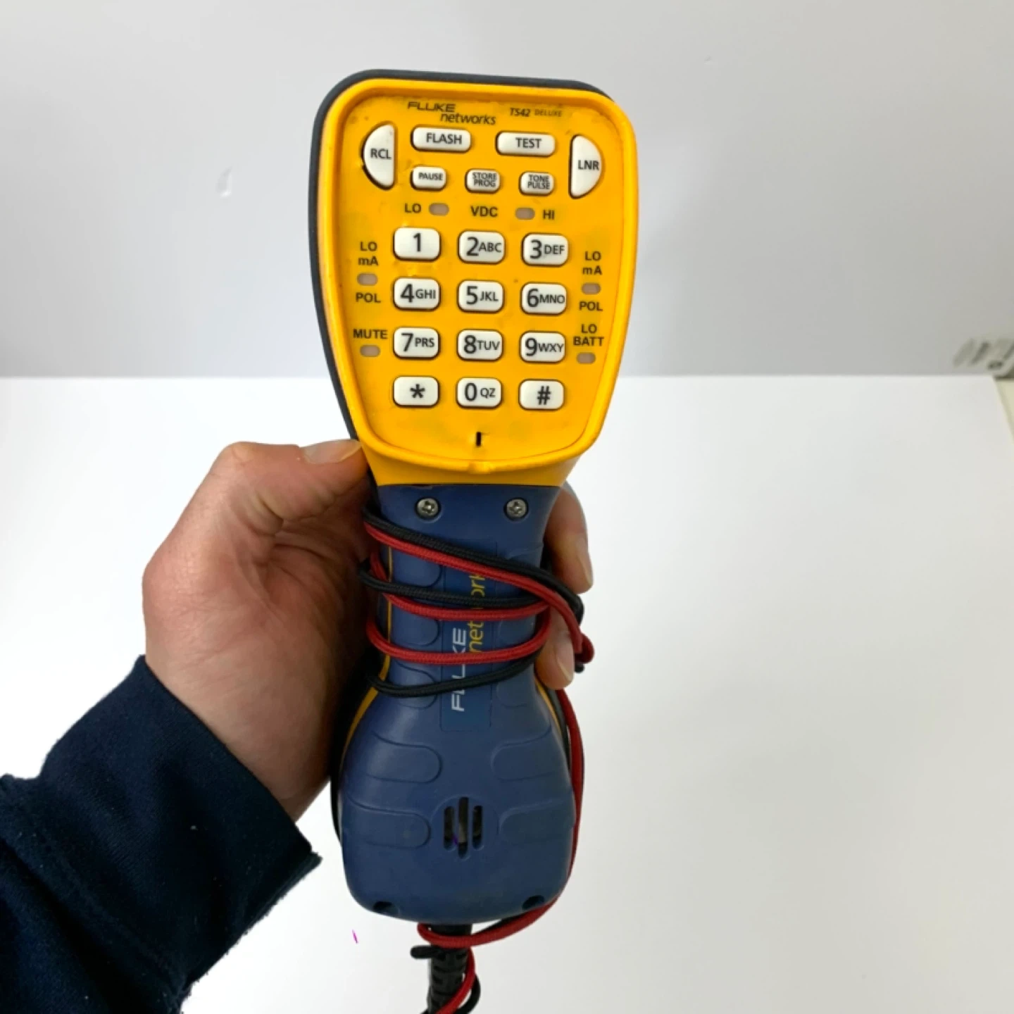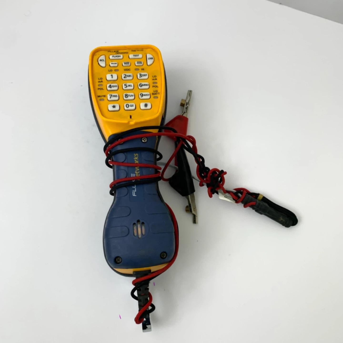This is a Fluke Networks TS42 Deluxe Tone and Probe Kit. It's yellow and blue and comes with alligator clip leads. This tool is great for testing network cables.