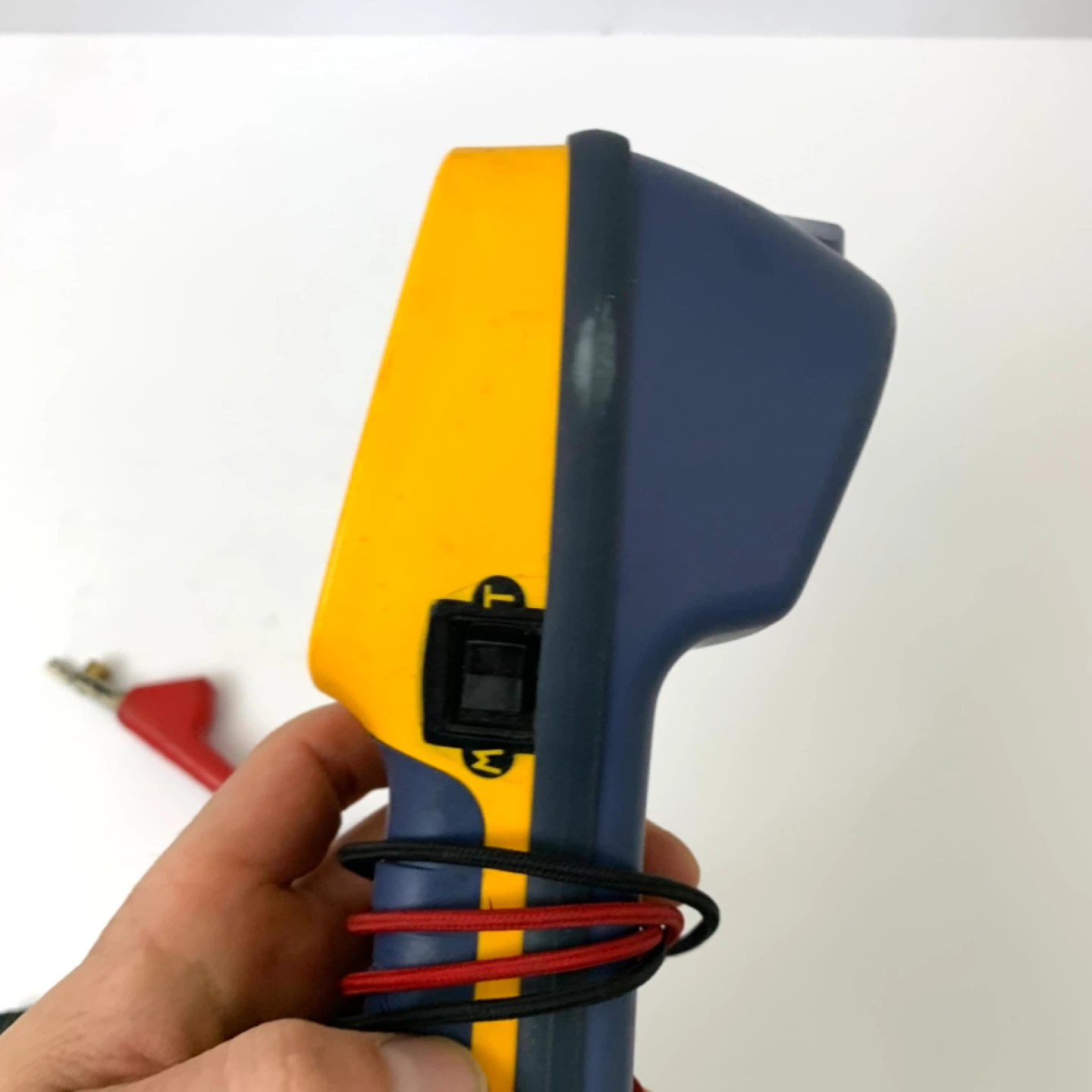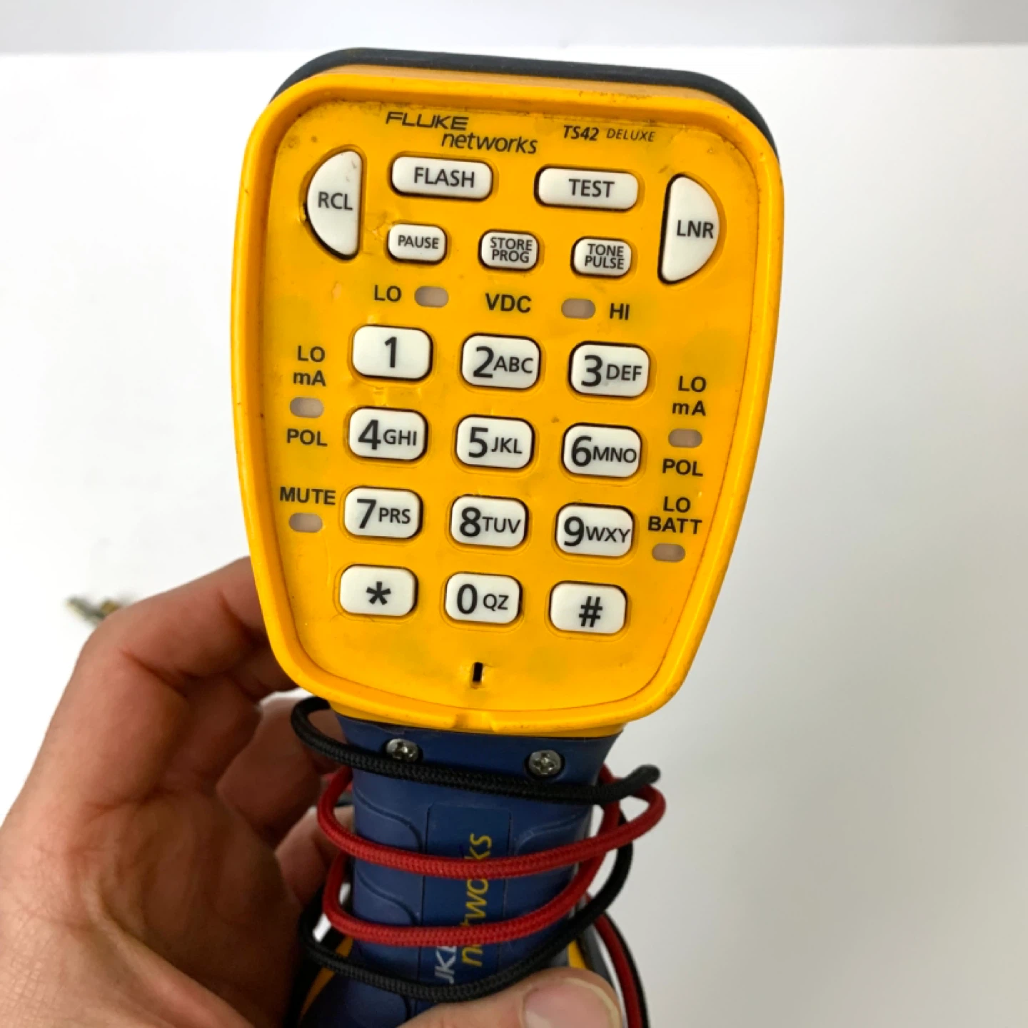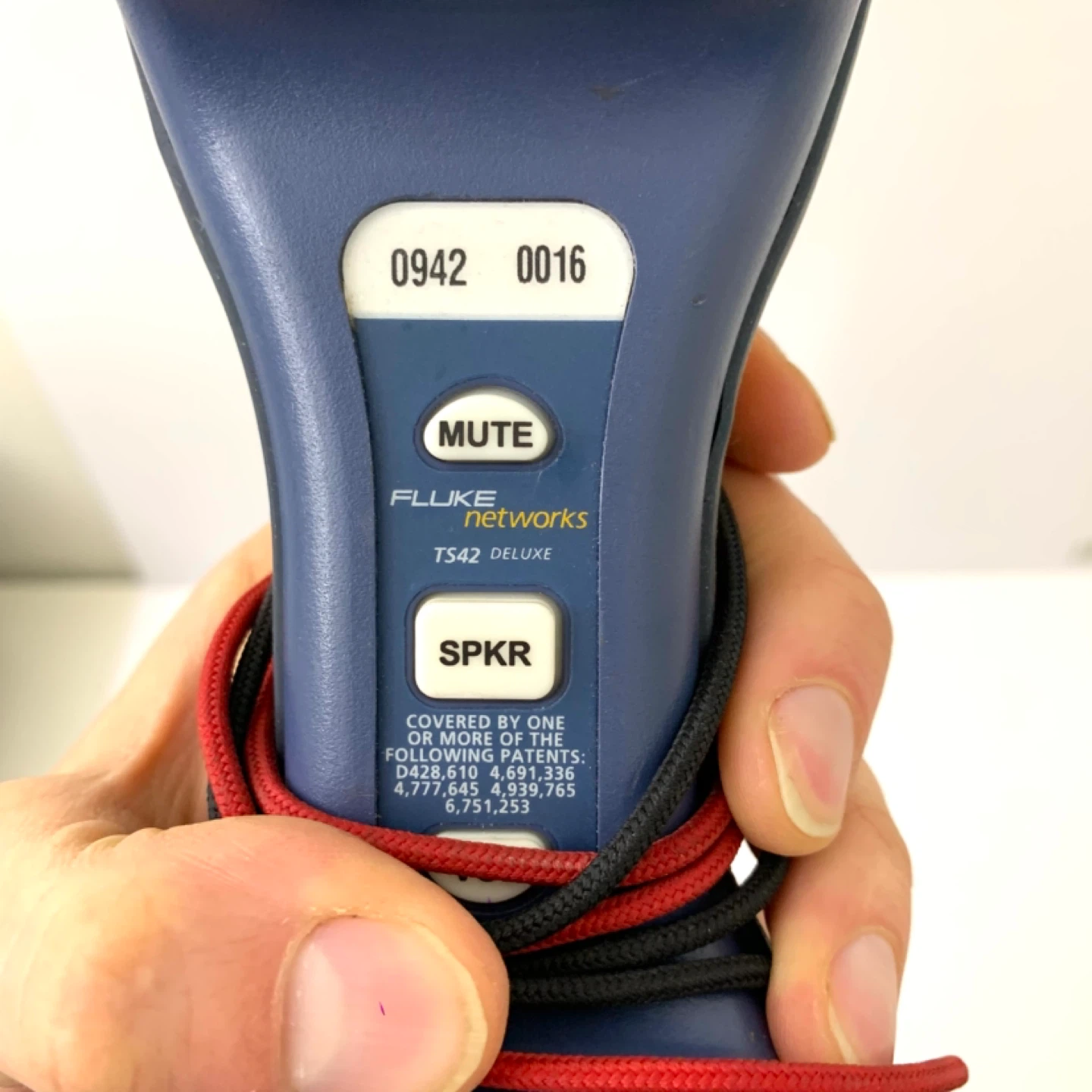 This is a Fluke Networks TS42 Deluxe Tone and Probe Kit. It's yellow and blue and comes with alligator clip leads. This tool is great for testing network cables.