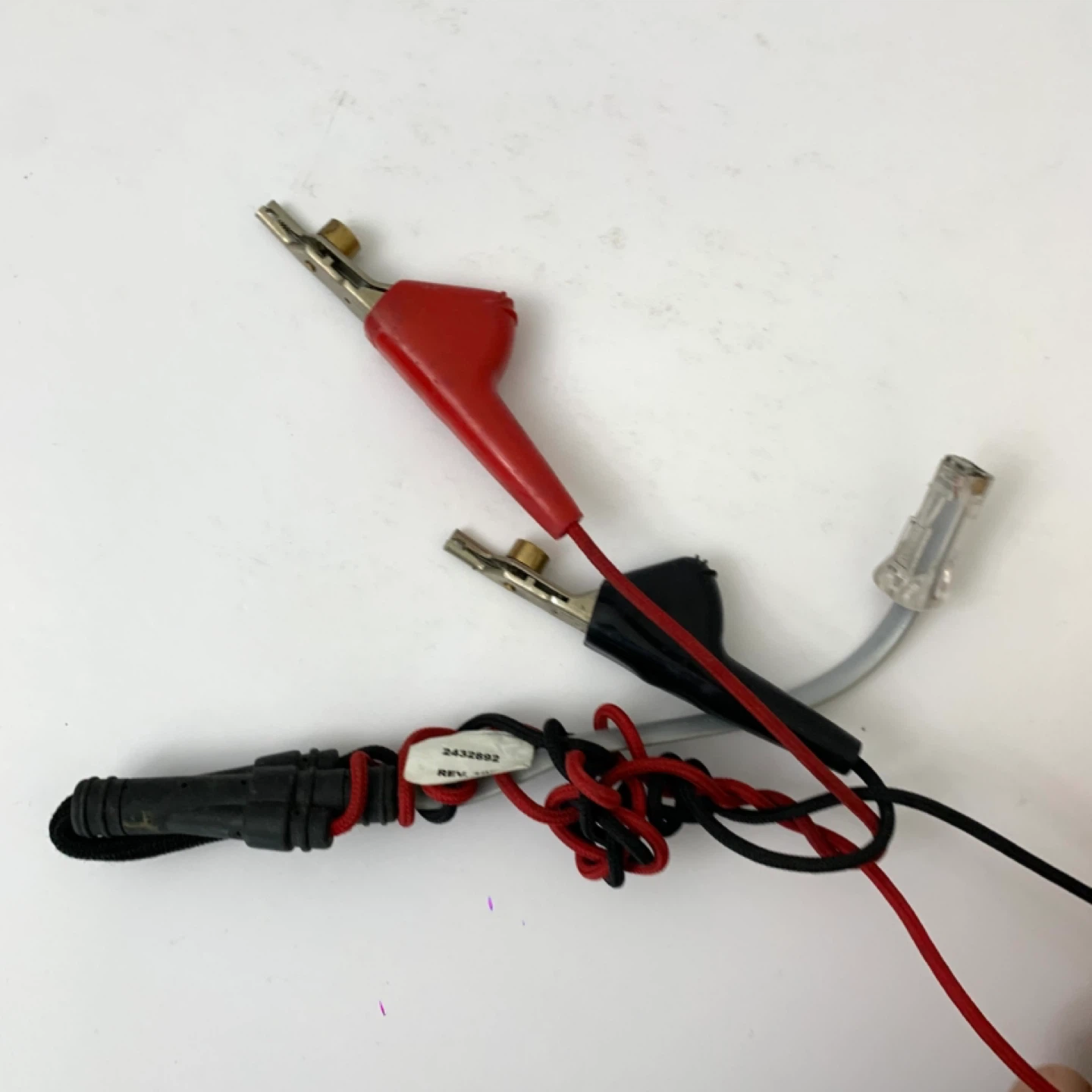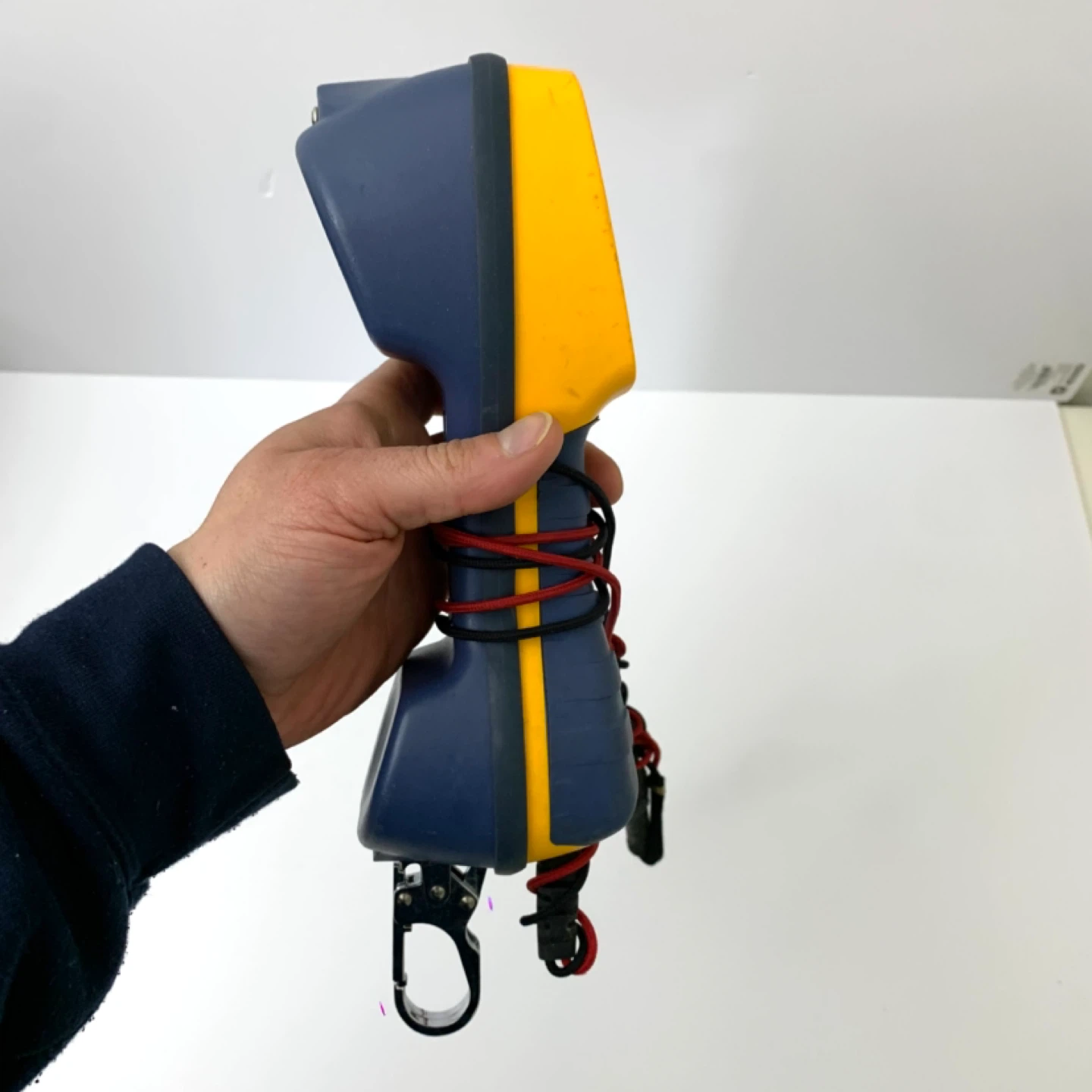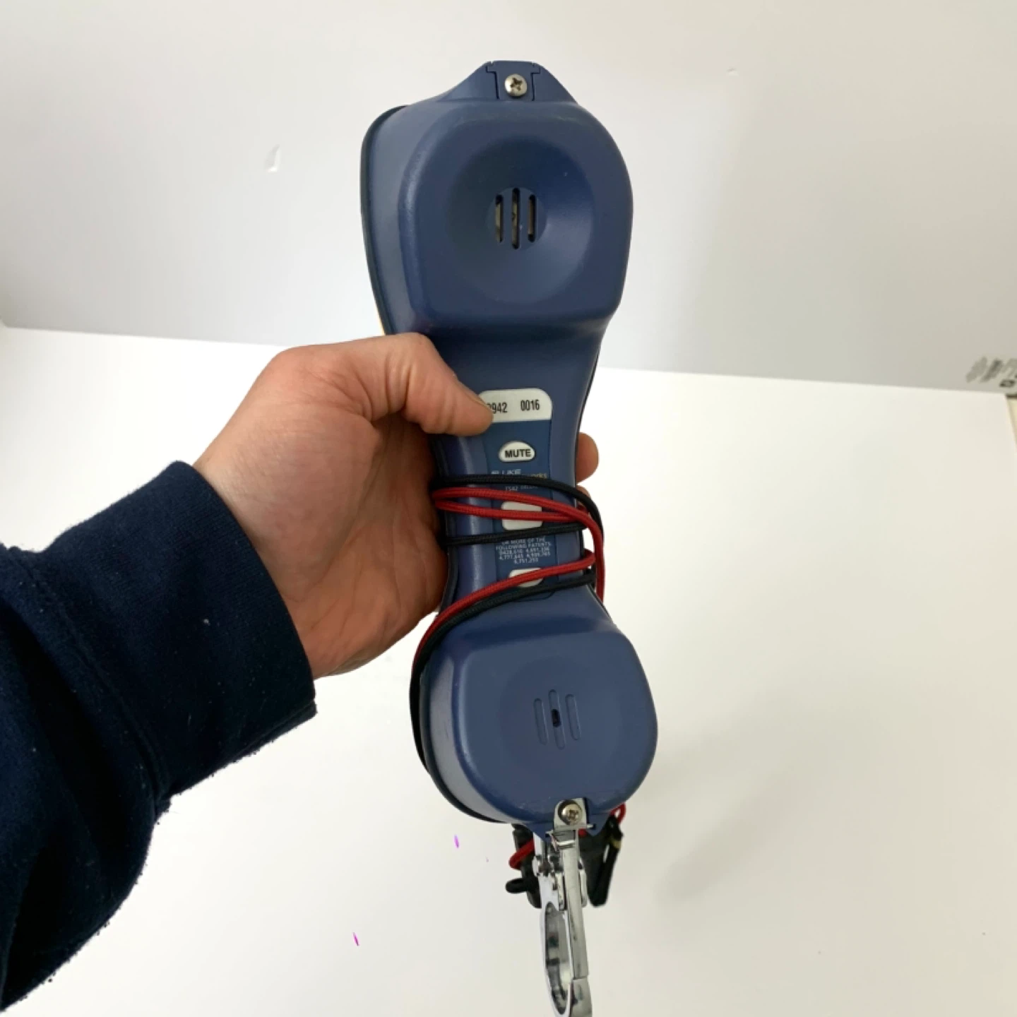 This is a Fluke Networks TS42 Deluxe Tone and Probe Kit. It's yellow and blue and comes with alligator clip leads. This tool is great for testing network cables.
