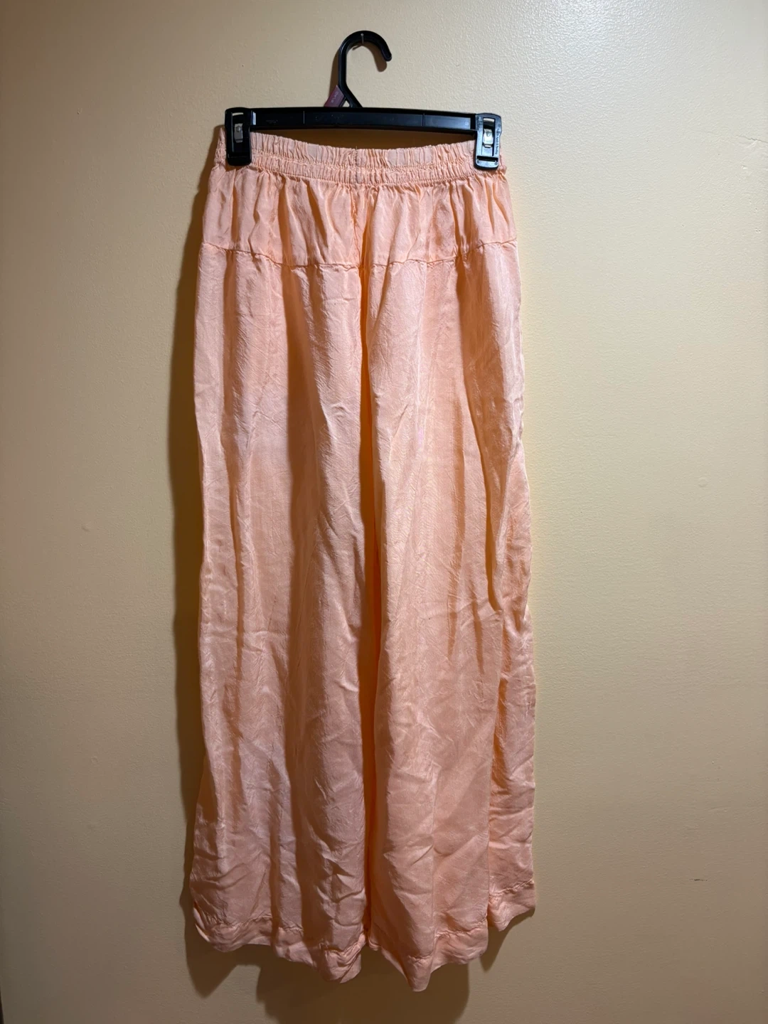 These flowy wide leg pants are a lovely peach color. They feature an elastic waistband for comfort. The material has a slightly crinkled texture.