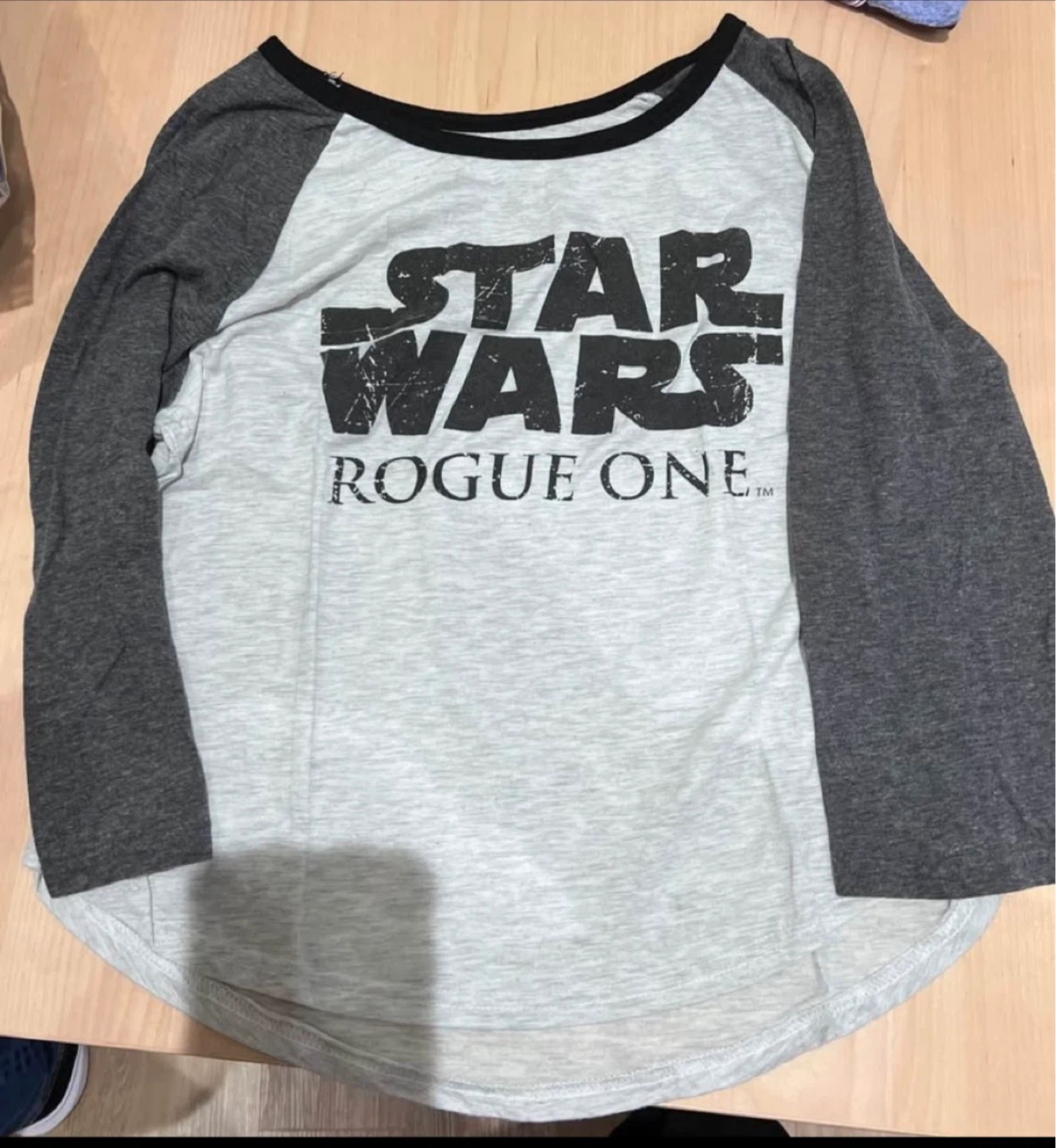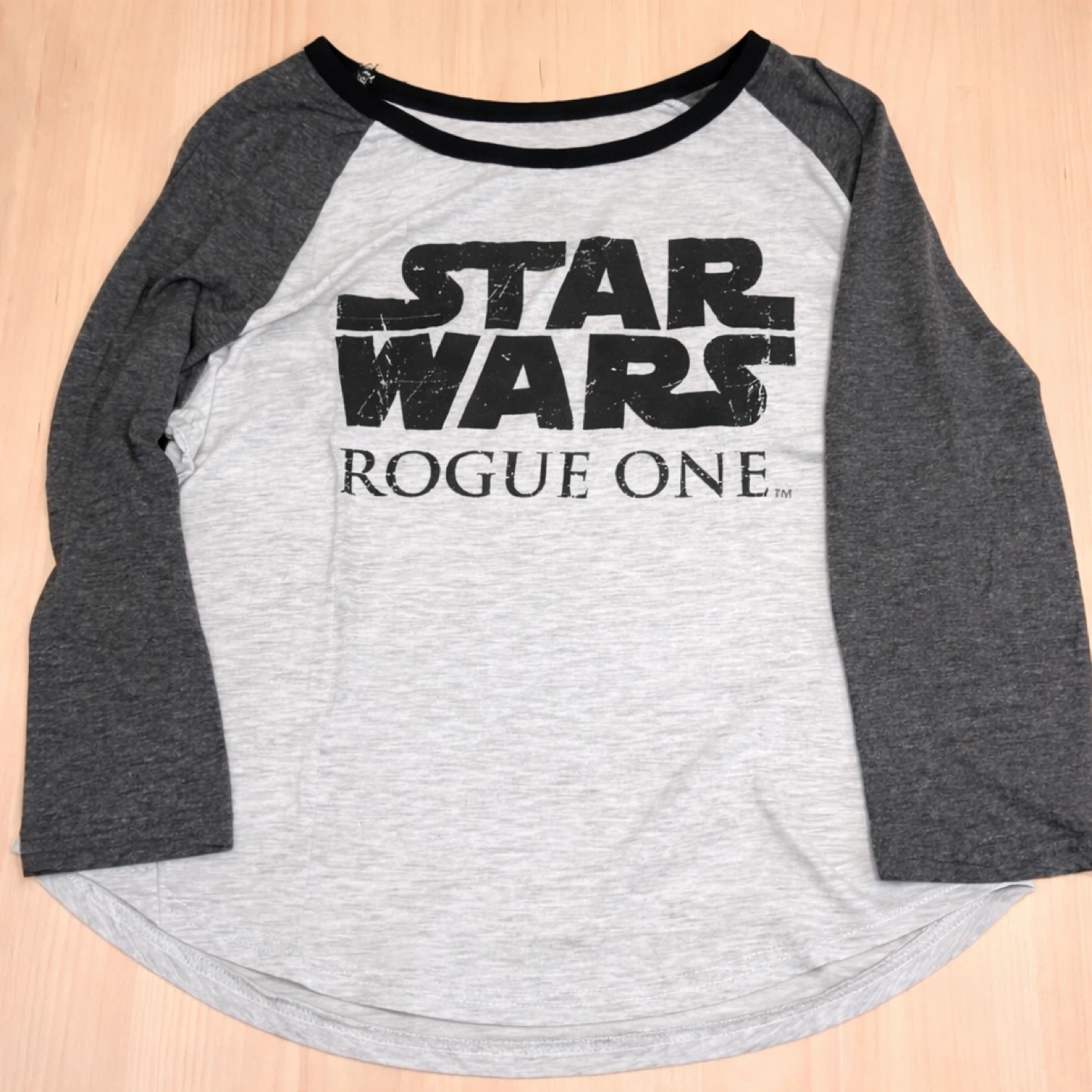 Star Wars “Rogue One” graphic tee in a classic grey and charcoal raglan style. Lightweight and comfortable with a relaxed fit—great for everyday wear or any Star Wars fan.