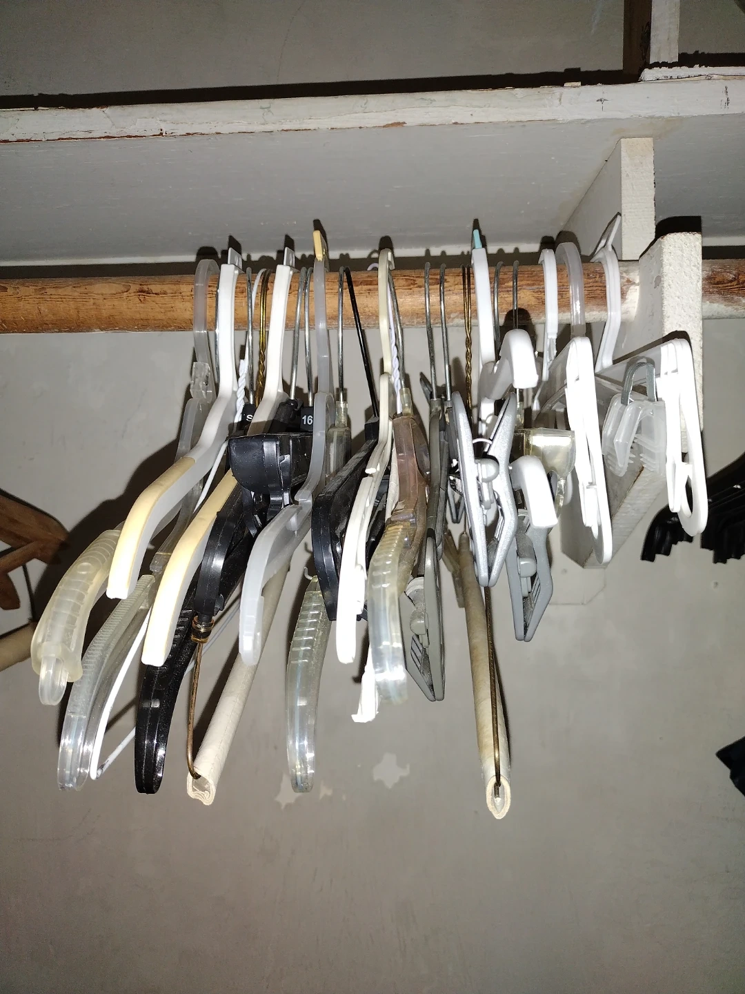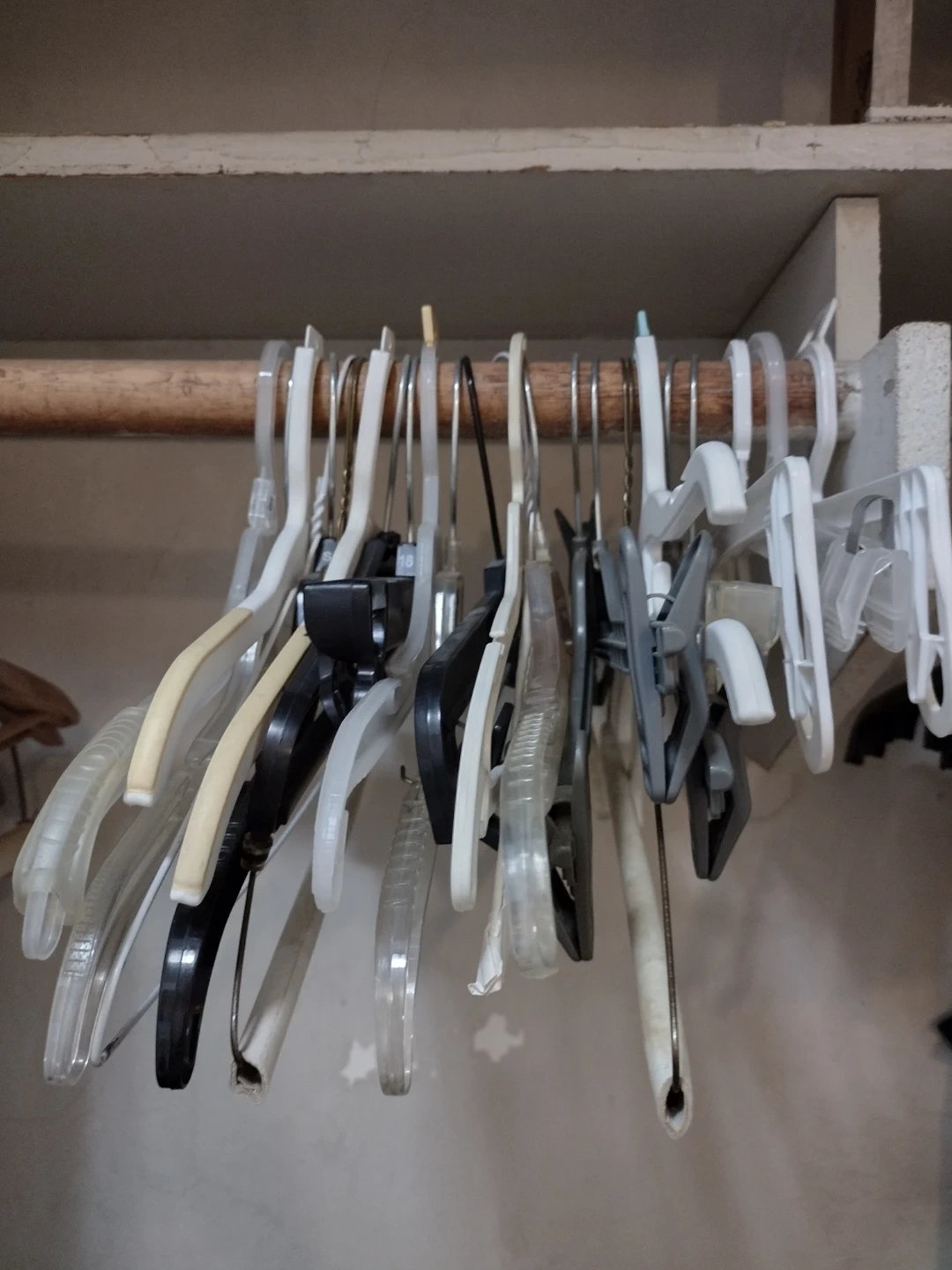 A collection of plastic and metal clothes hangers. Includes various styles for different garment types. Keep your closet organized!