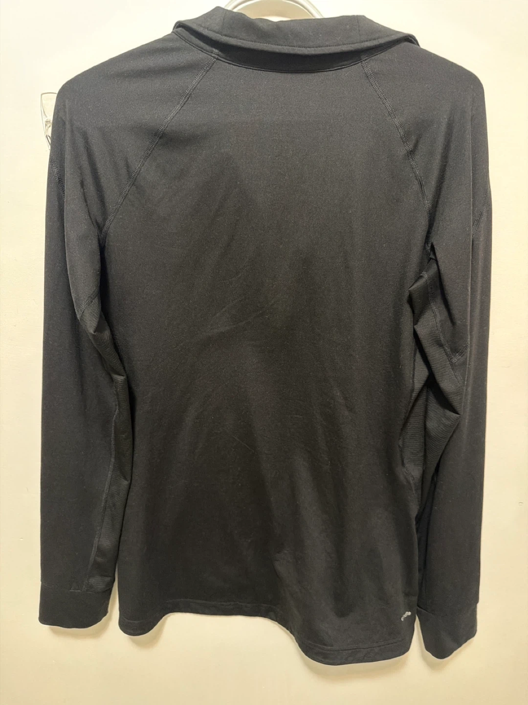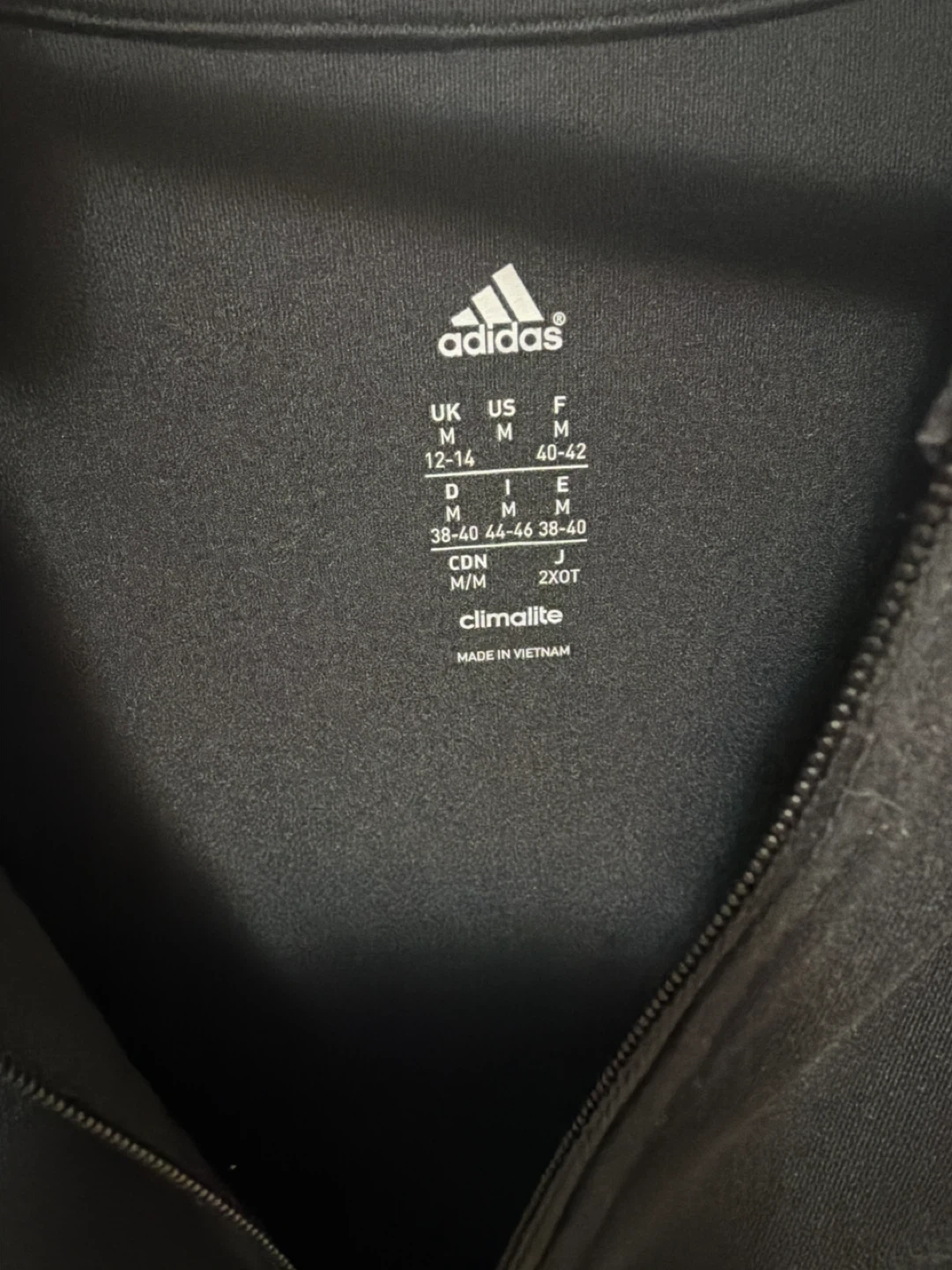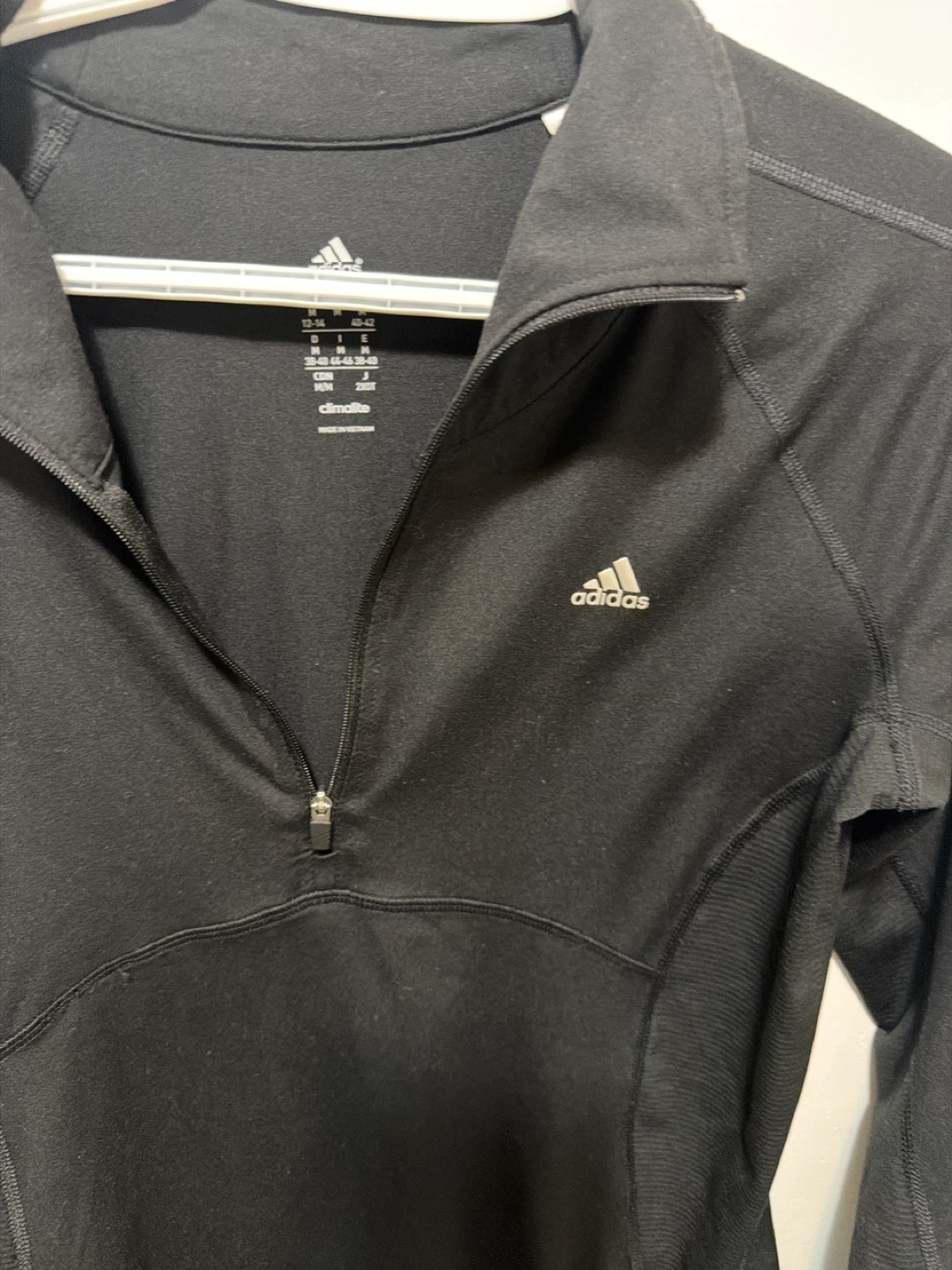 Black Adidas long-sleeve shirt with quarter-zip neckline. It's made with Climalite fabric for moisture-wicking. Size is medium.