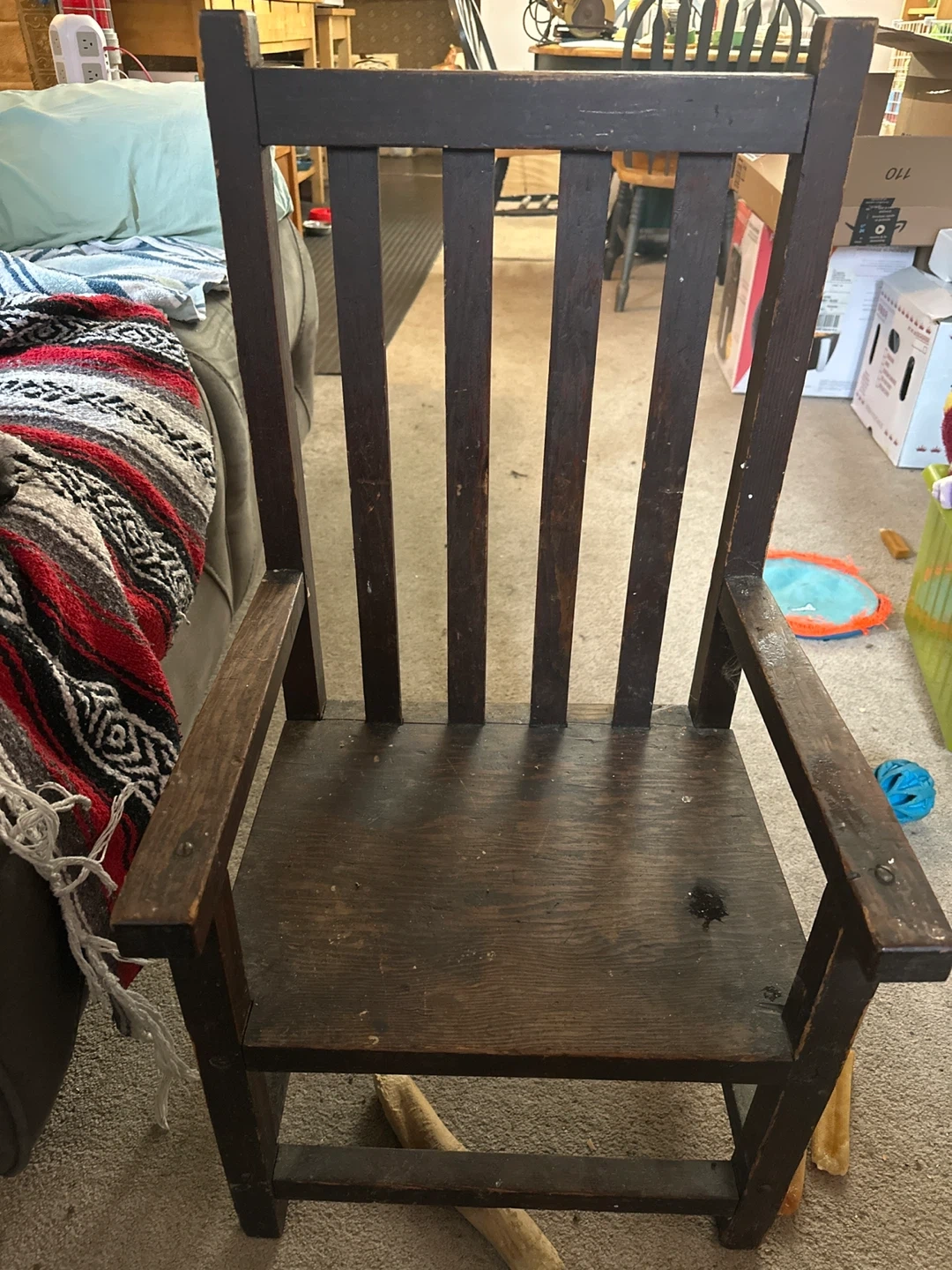 Buy & SellDark Wood ArmchairDark Wood Armchair$28This is a dark wood armchair with a slatted back and arms. It shows some signs of wear consistent with its age. Wooden construction.WHERE TO MEETtownhomes parking lotView MapSELLERAprilMoody Centre151 review0 chats·0 favorites·2 viewsSEND CHAT TO SELLERHi April! I’m interested in your listing.Hi April! I’m interested in your listing.Get the Karrot app to chatSign In to chat
