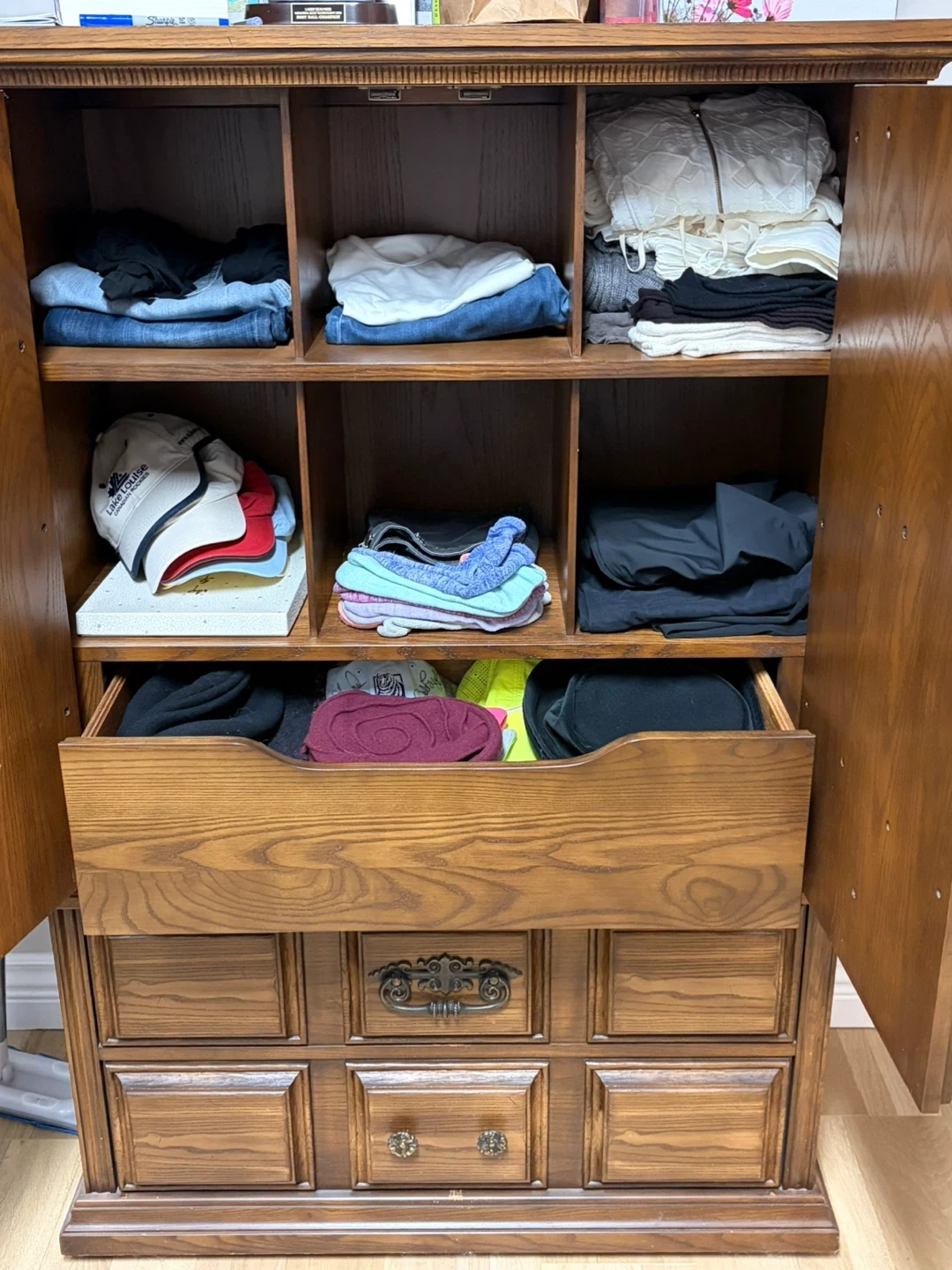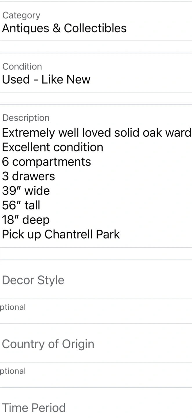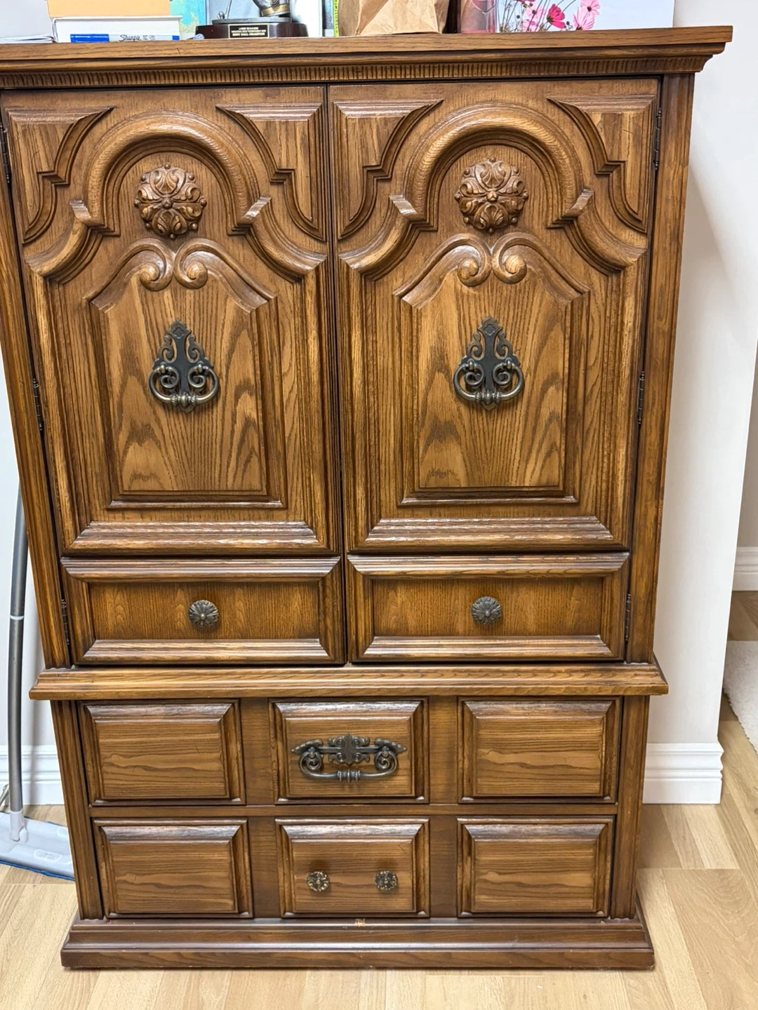 Extremely well loved solid oak wardrobe in excellent condition. It has 6 compartments and 3 drawers for ample storage. Dimensions are 39" wide, 56" tall, and 18" deep.