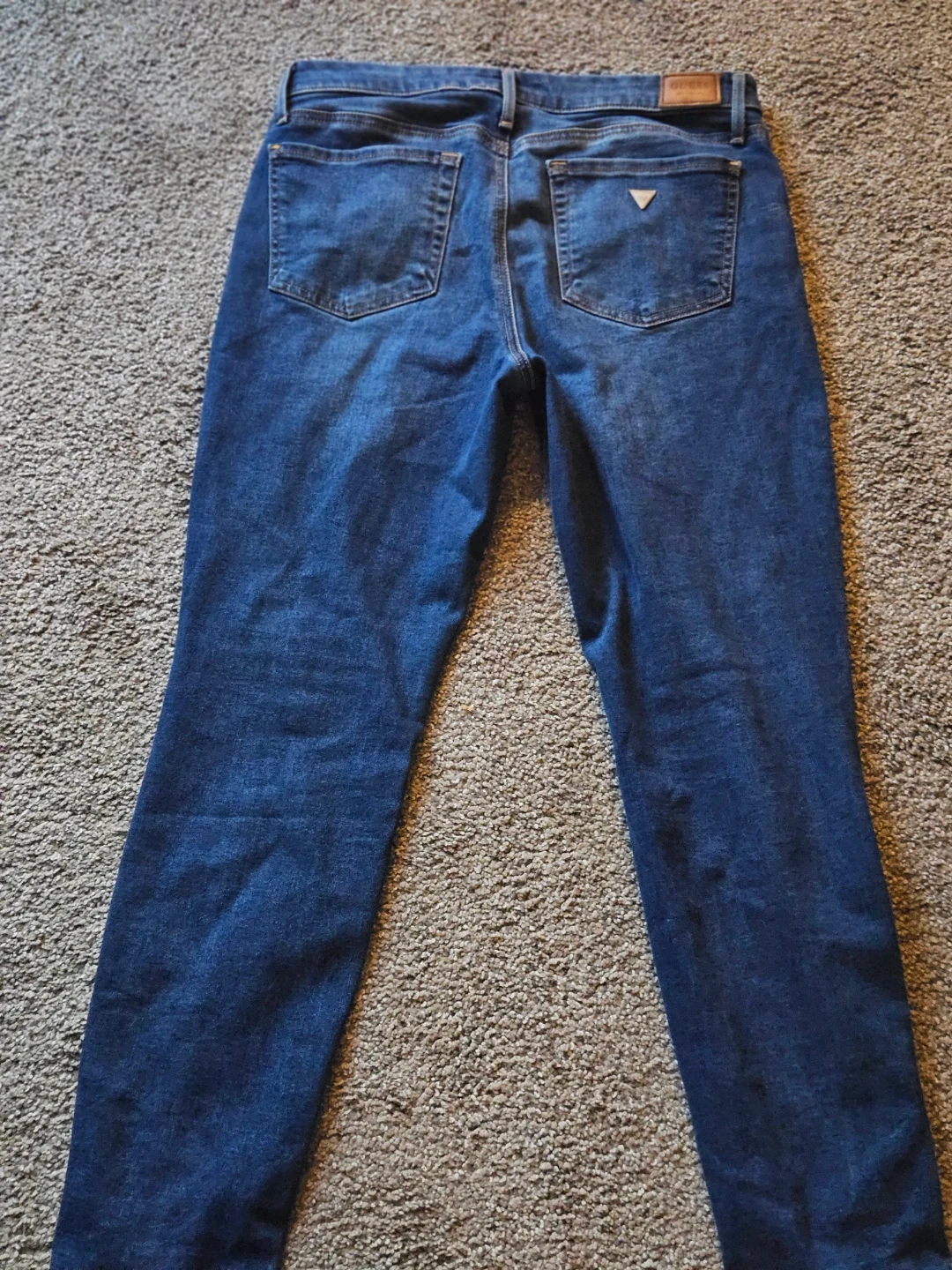 Blue wash denim skinny jeans from Guess. These jeans feature a classic five-pocket design and a mid-rise fit. Size 28 waist. Comfortable stretch fabric.
