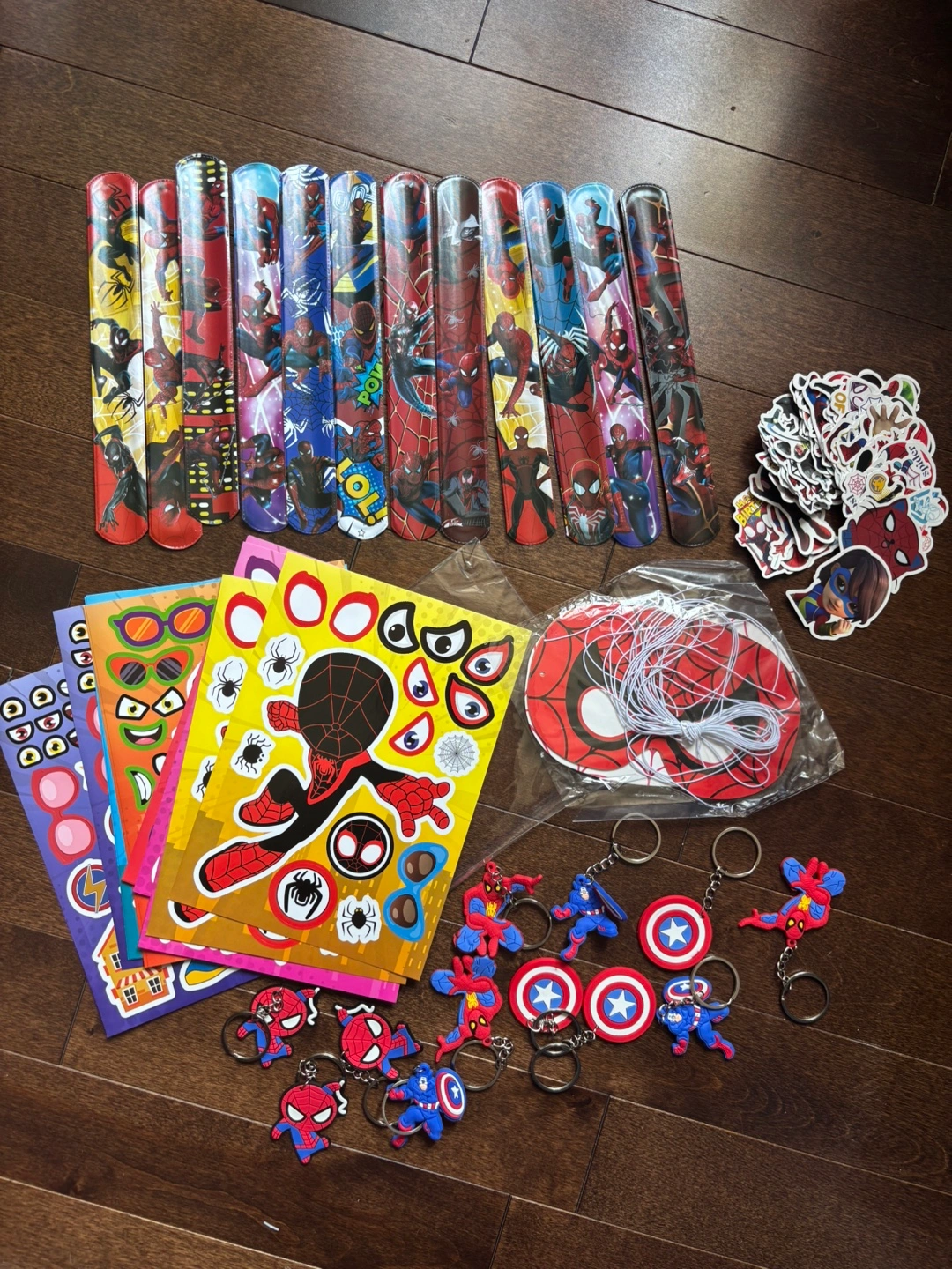 Spiderman party kit. Includes various wearable items, stickers, and other novelties. Decorate your party space, or let the kids enjoy some fun. A great idea to bring some joy to your day.