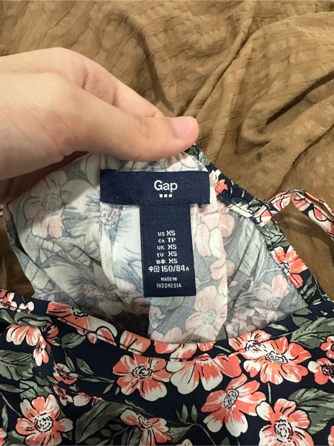 This Gap dress features a navy background with a floral print in coral, white, and green. It has adjustable straps and an elasticated empire waist. Made in Indonesia.