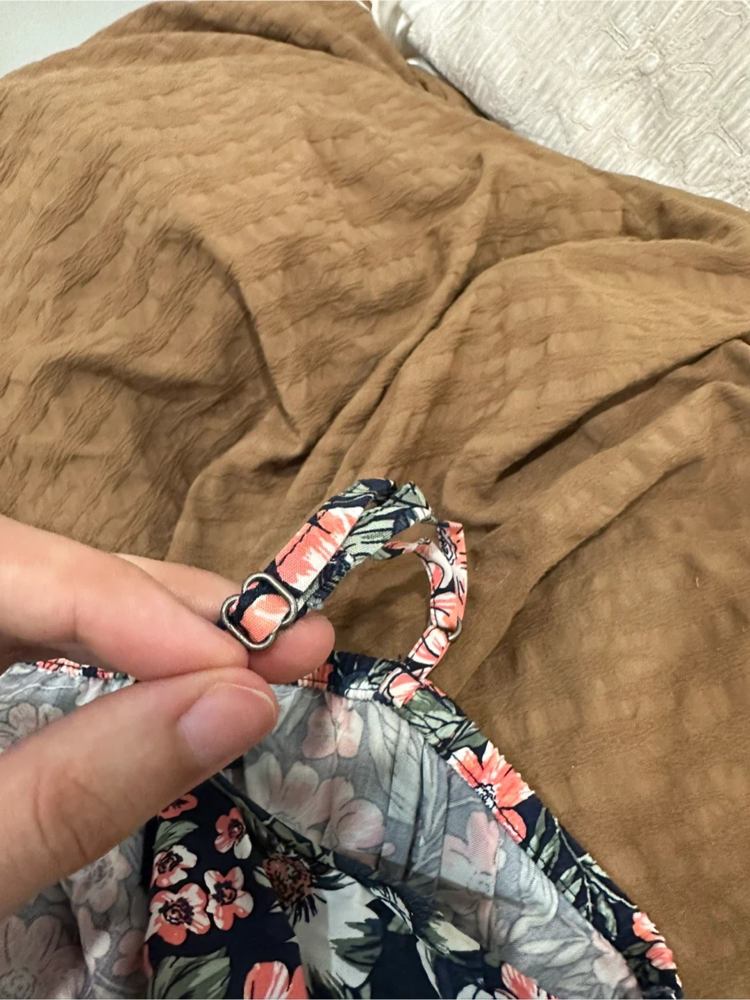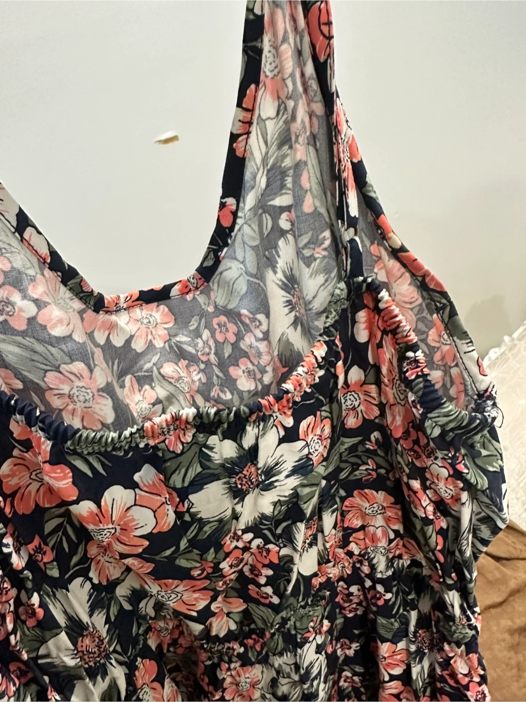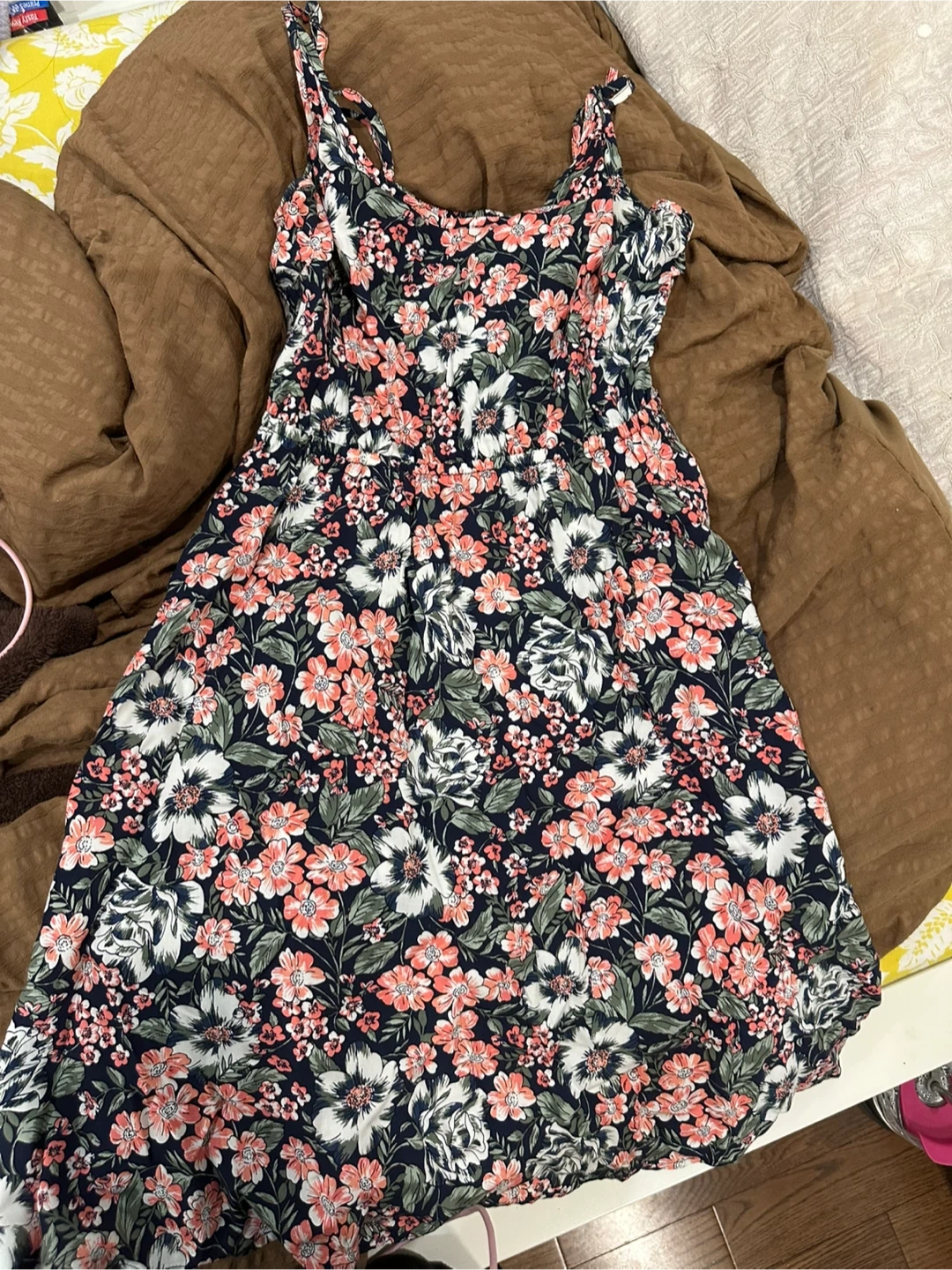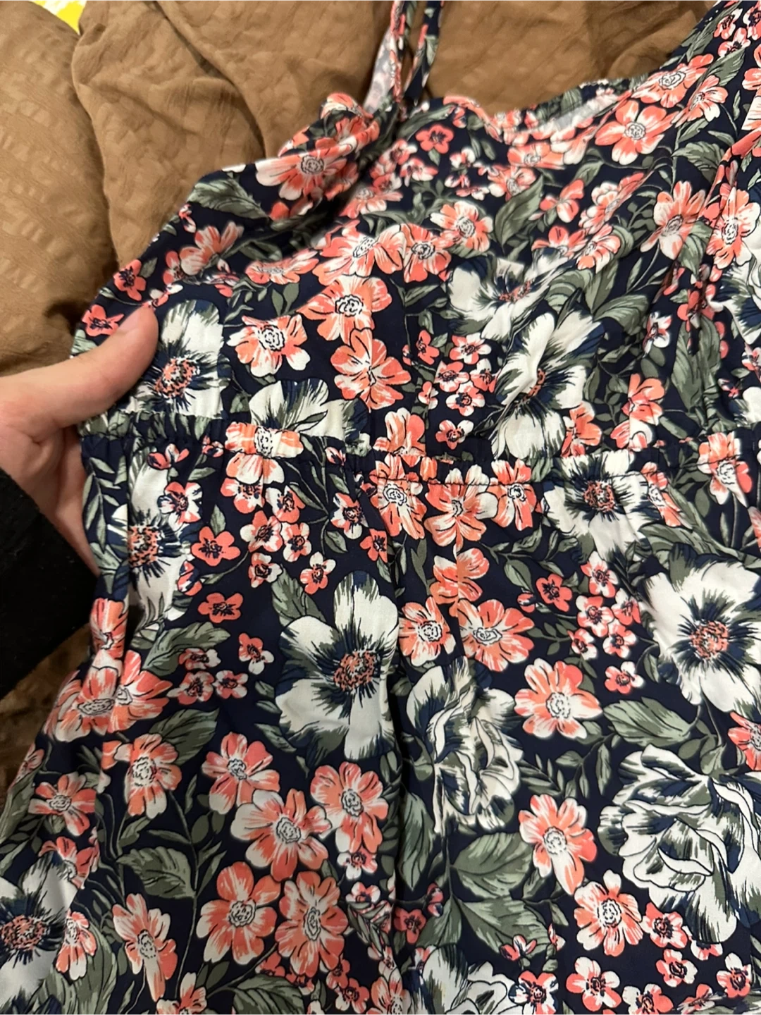 This Gap dress features a navy background with a floral print in coral, white, and green. It has adjustable straps and an elasticated empire waist. Made in Indonesia.