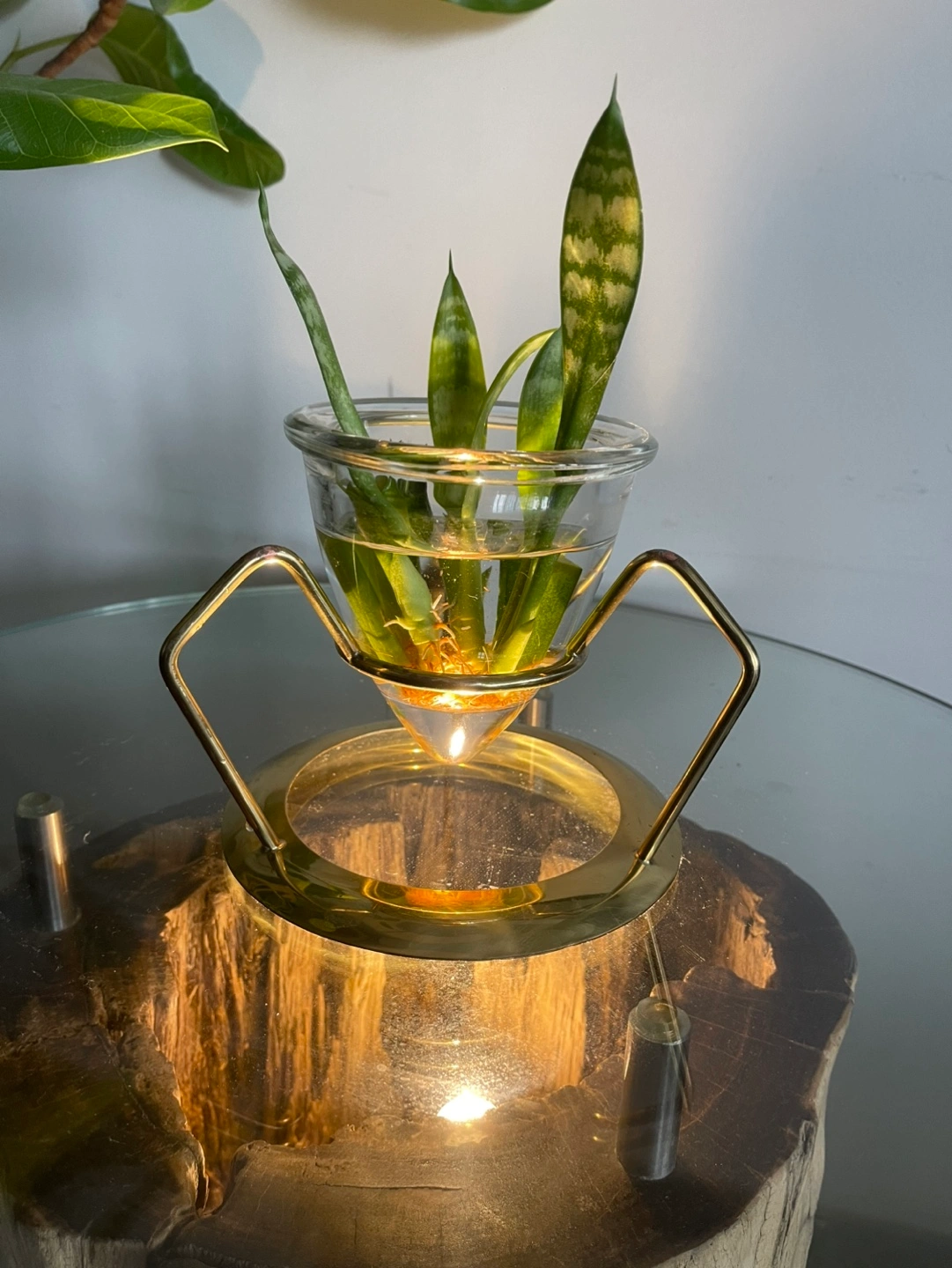 Unique glass hydroponic planter. Features a brass stand .Perfect for propagating plants or displaying cuttings. Minimalist design, great for modern decor.