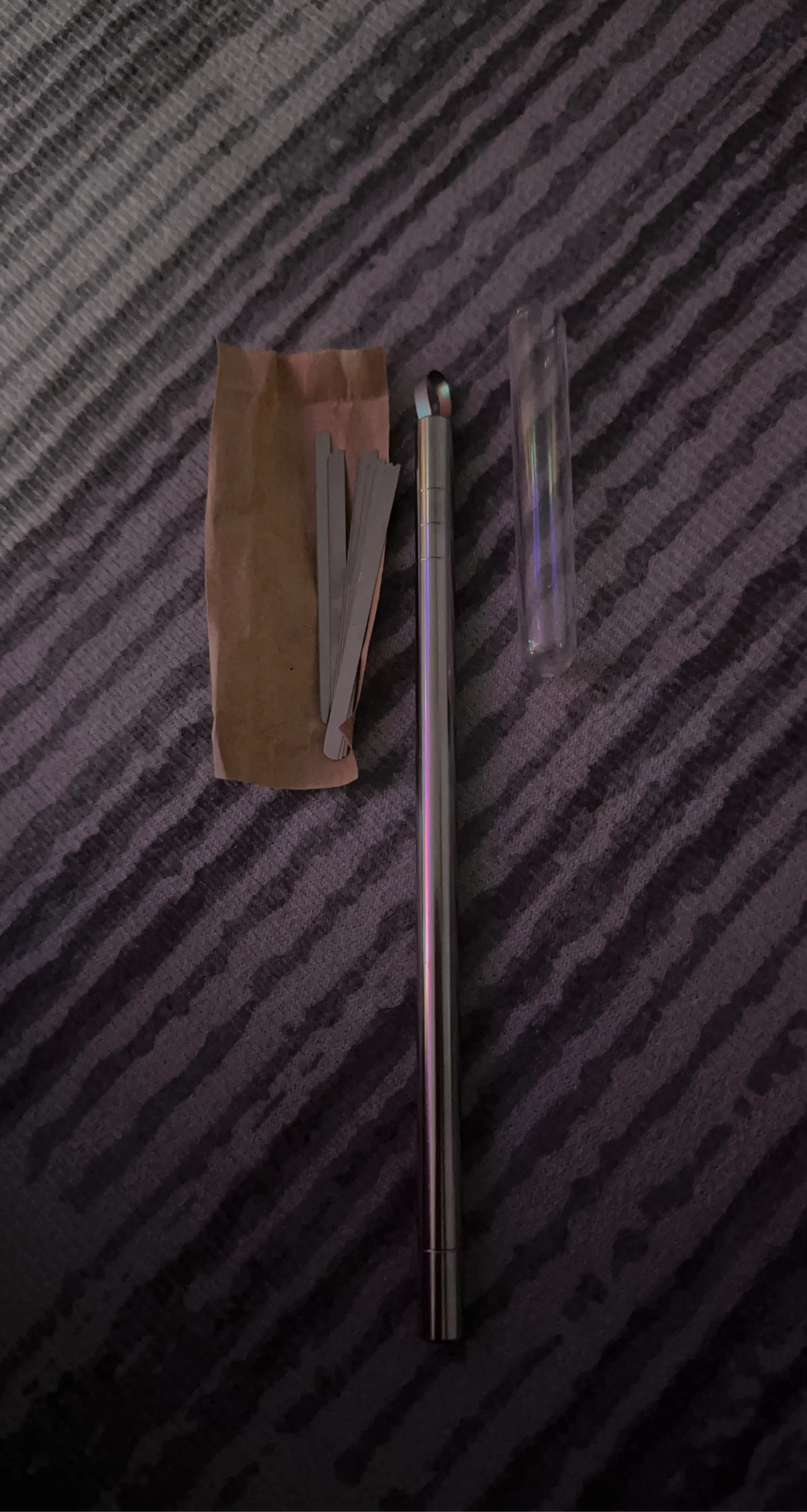A portable metal smoking pipe with a clear cap. It includes a small brown paper pouch with several filter papers inside. This set is convenient for on-the-go use.