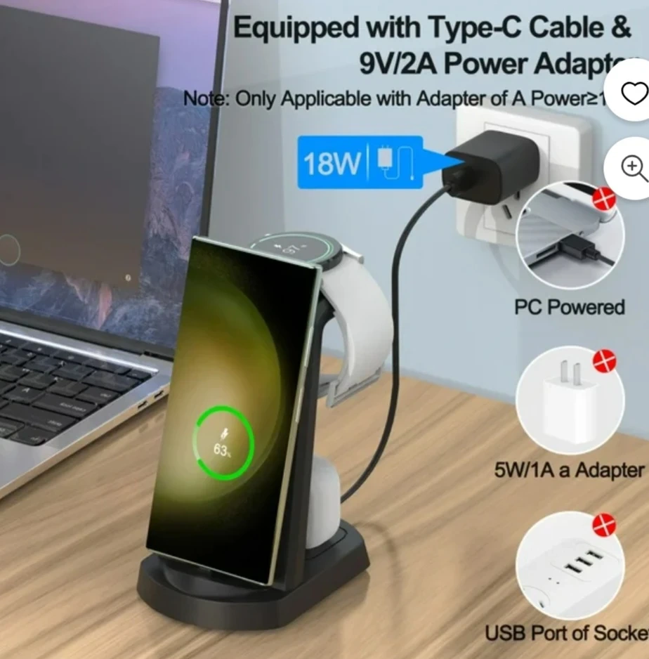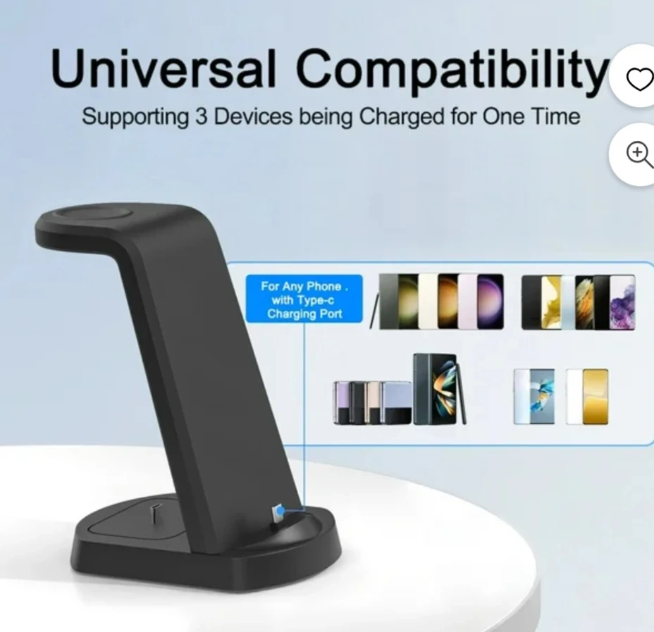 This is a 3-in-1 wireless charger stand for your phone, watch, and earbuds. It comes with a Type-C cable and a 9V/2A power adapter. It is compatible with phone cases and accessories.