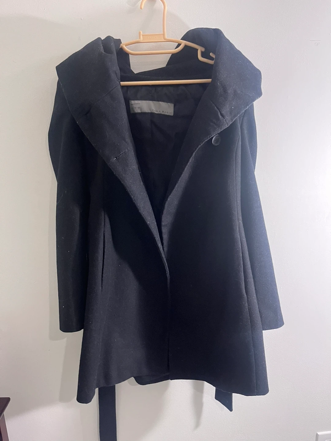 Zara Basic black wool blend coat with a large collar and belt. It's made of a soft fabric that's perfect for cooler weather. This coat would be a stylish addition to any wardrobe!