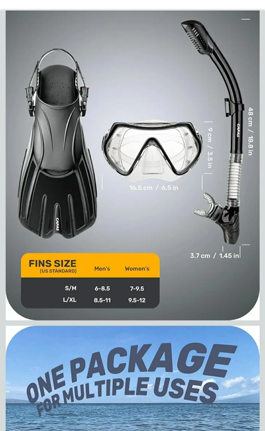 CAPAS Snorkel Set - Fins, Mask, Snorkel - New