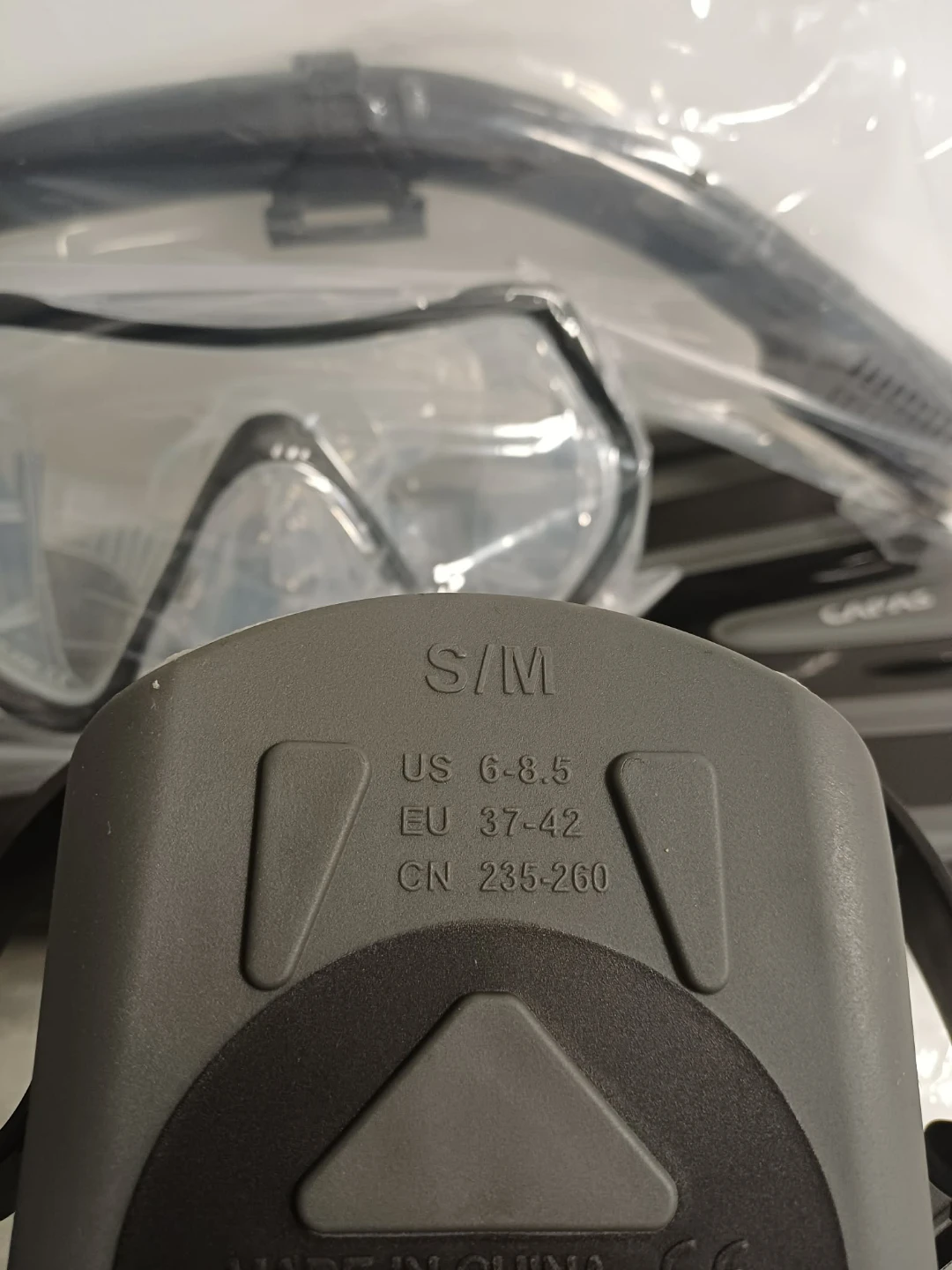 Get ready for summer with this brand new CAPAS snorkel set! This set includes fins, a mask, and a snorkel, all still in the original packaging. The fins are size S/M (US Men's 6-8.5, Women's 7-9.5). The set is designed for adding speed and propulsion in the water, with an anti-slip sole for secure standing and a reinforced edge to reduce tearing under pressure. The snorkel has a one-way drain valve for easy exhaling