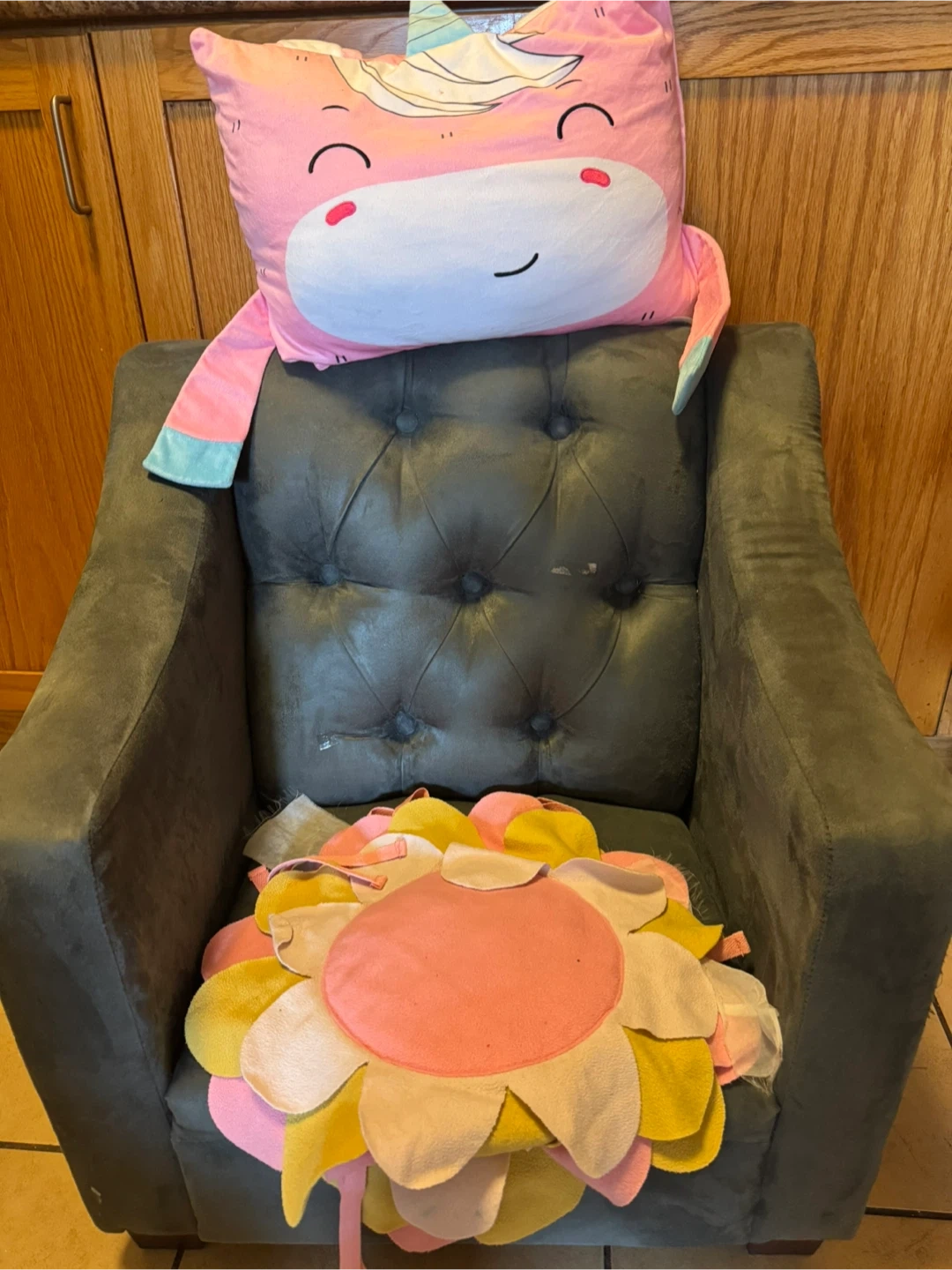 Selling a cozy grey upholstered armchair, kid size. It's in good condition and would be a great addition to any playroom or a living room or bedroom for the tiny one. Pillow and seat covers come with it.