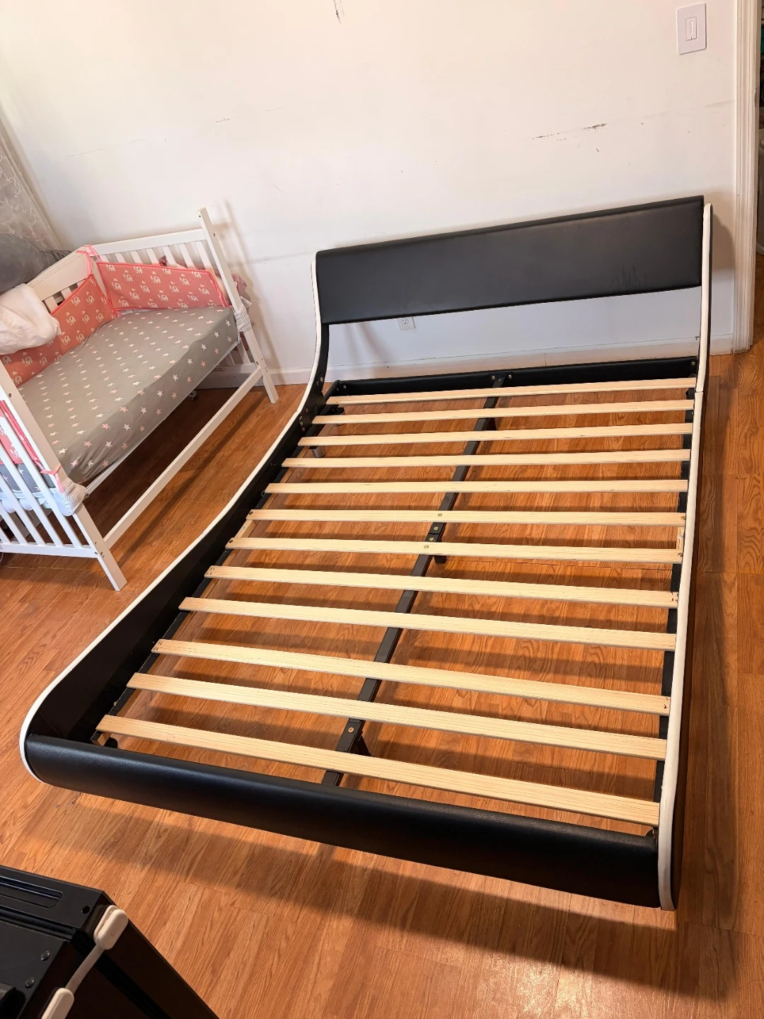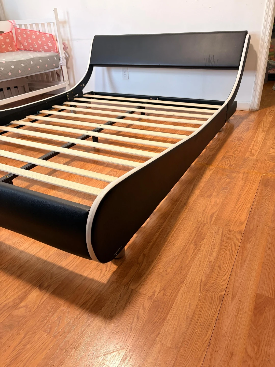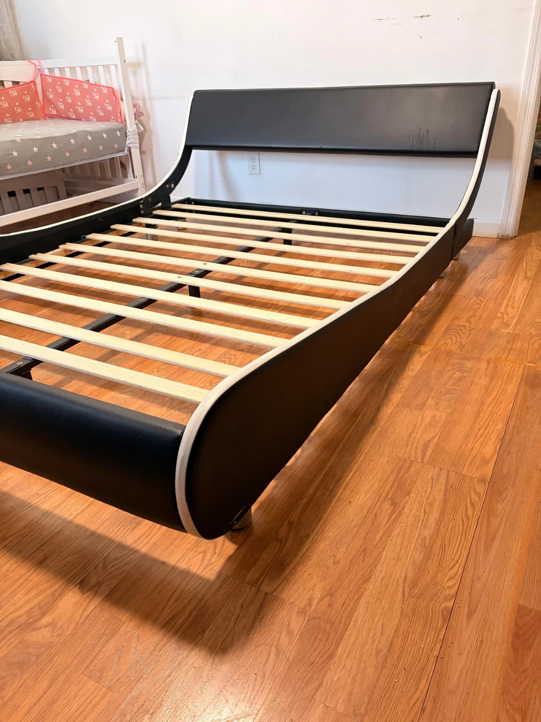 Queen size bed frame with a black faux leather finish and white piping. It features a curved headboard and footboard design with durable wooden slat support. This frame is built for lasting comfort and style in your bedroom!