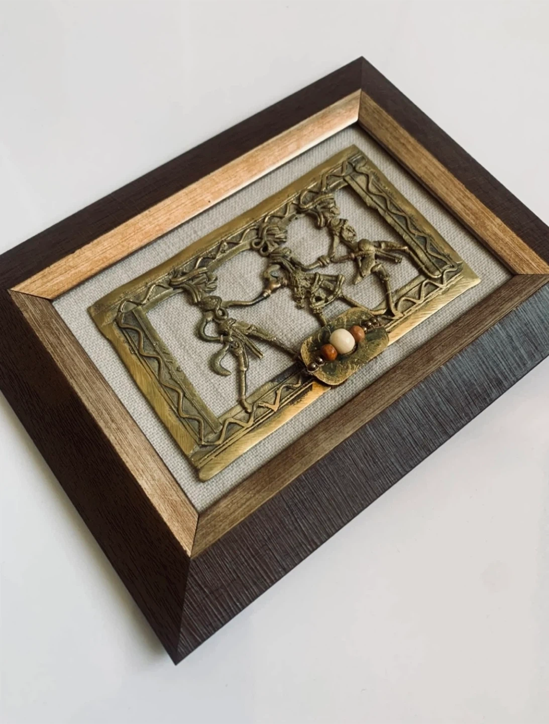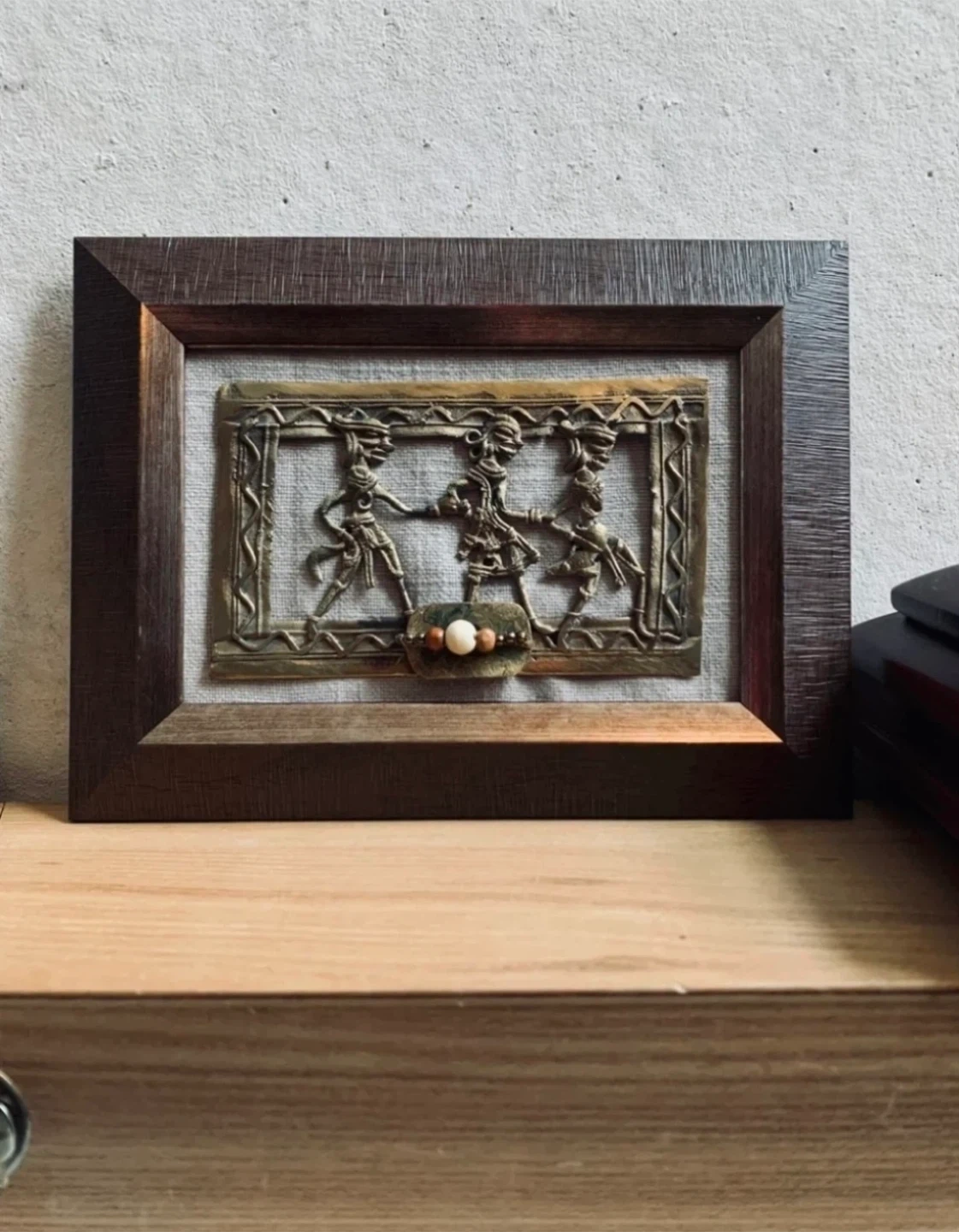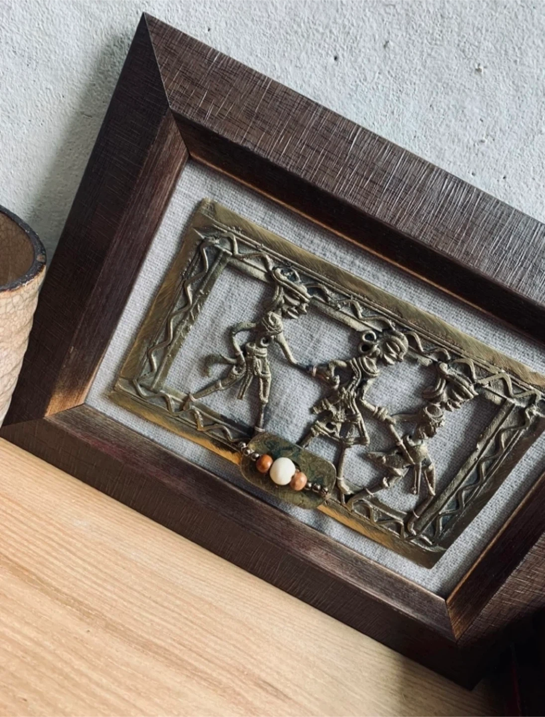 •This unique framed art piece features a brass relief of three dancing figures. The metallic artwork is set against a textured fabric background.