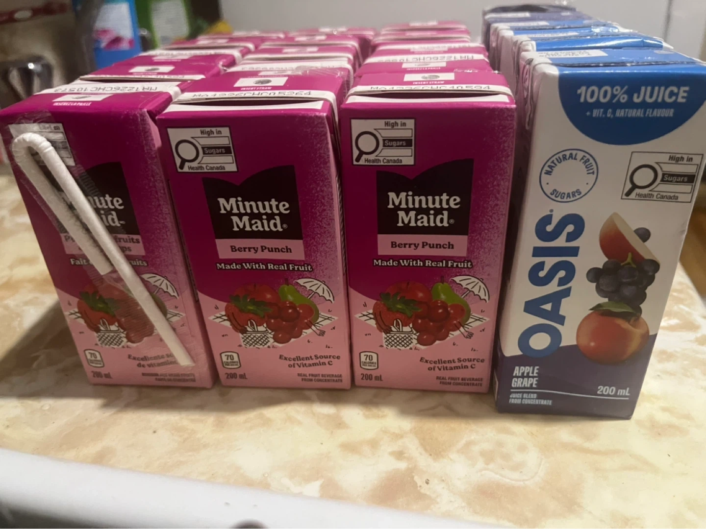 This lot includes several Minute Maid Berry Punch juice boxes and Oasis Apple Grape juice boxes. Each box is 200ml
