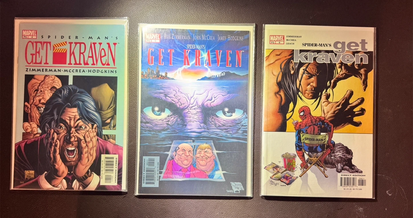 Three issues of Marvel's Spider-Man Get Kraven comic book series. These issues feature artwork and stories by Ron Zimmerman, John McCrea, and James Hodgkins. A great addition to any comic collection!