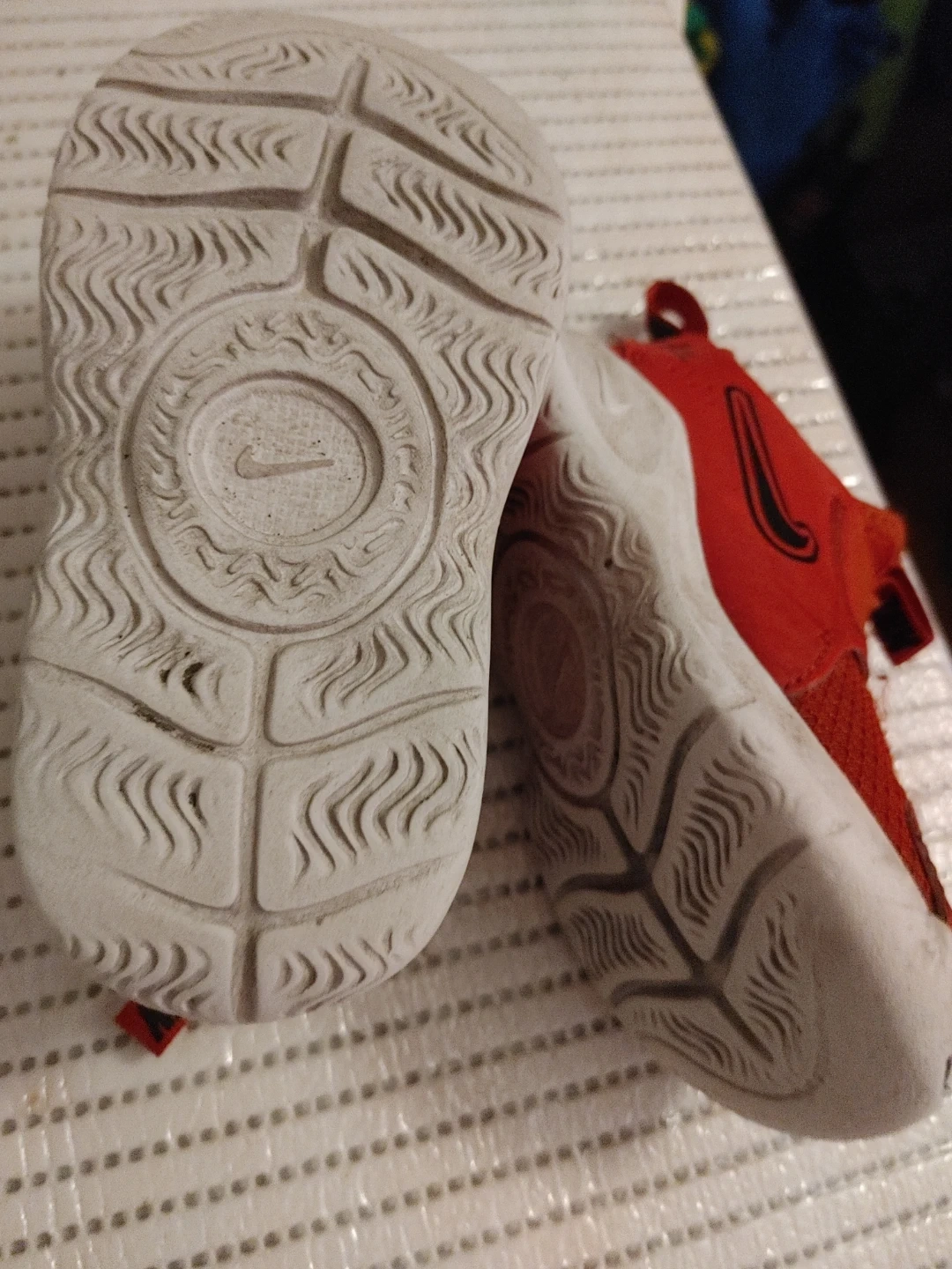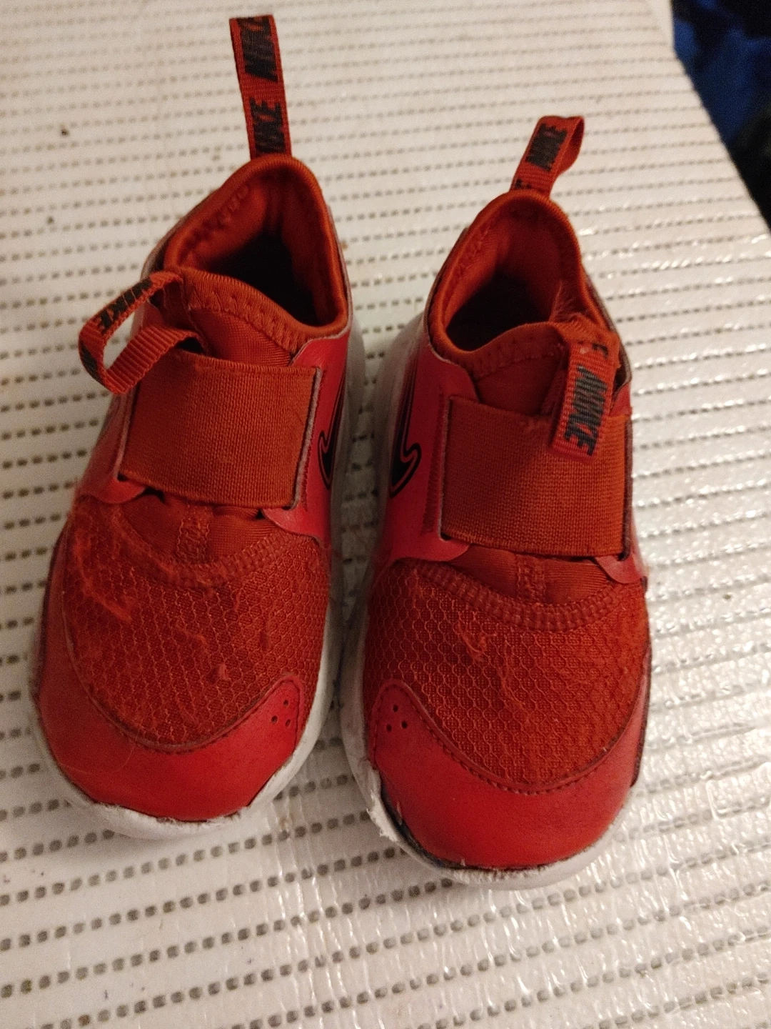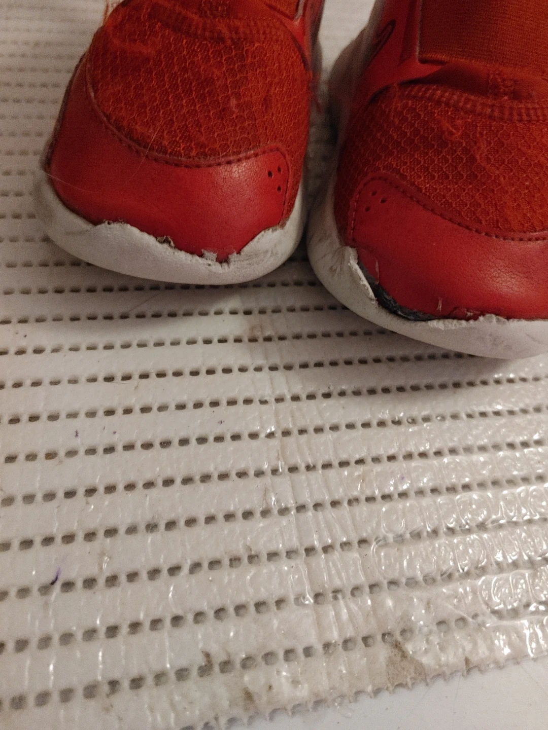 These red Nike slip-on shoes are designed for toddlers. They feature a convenient pull tab at the heel and a secure elastic strap across the top. The soles offer good grip. They're great for active little ones on the go!