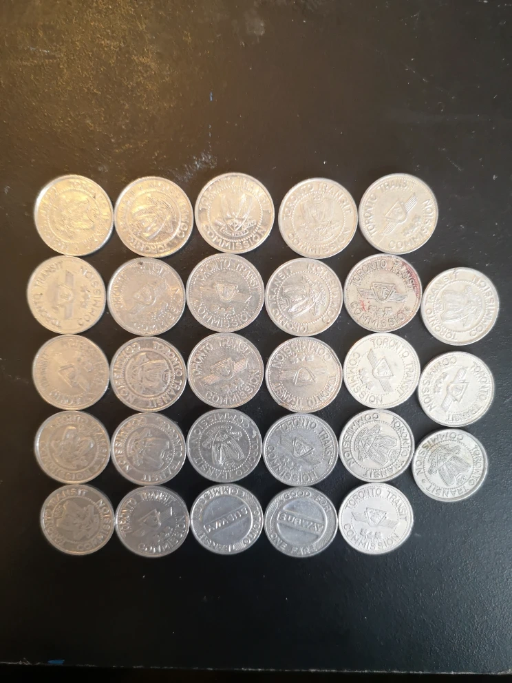 Collection of Toronto Transit Commission tokens. Great for collectors. Various designs. Metal tokens.