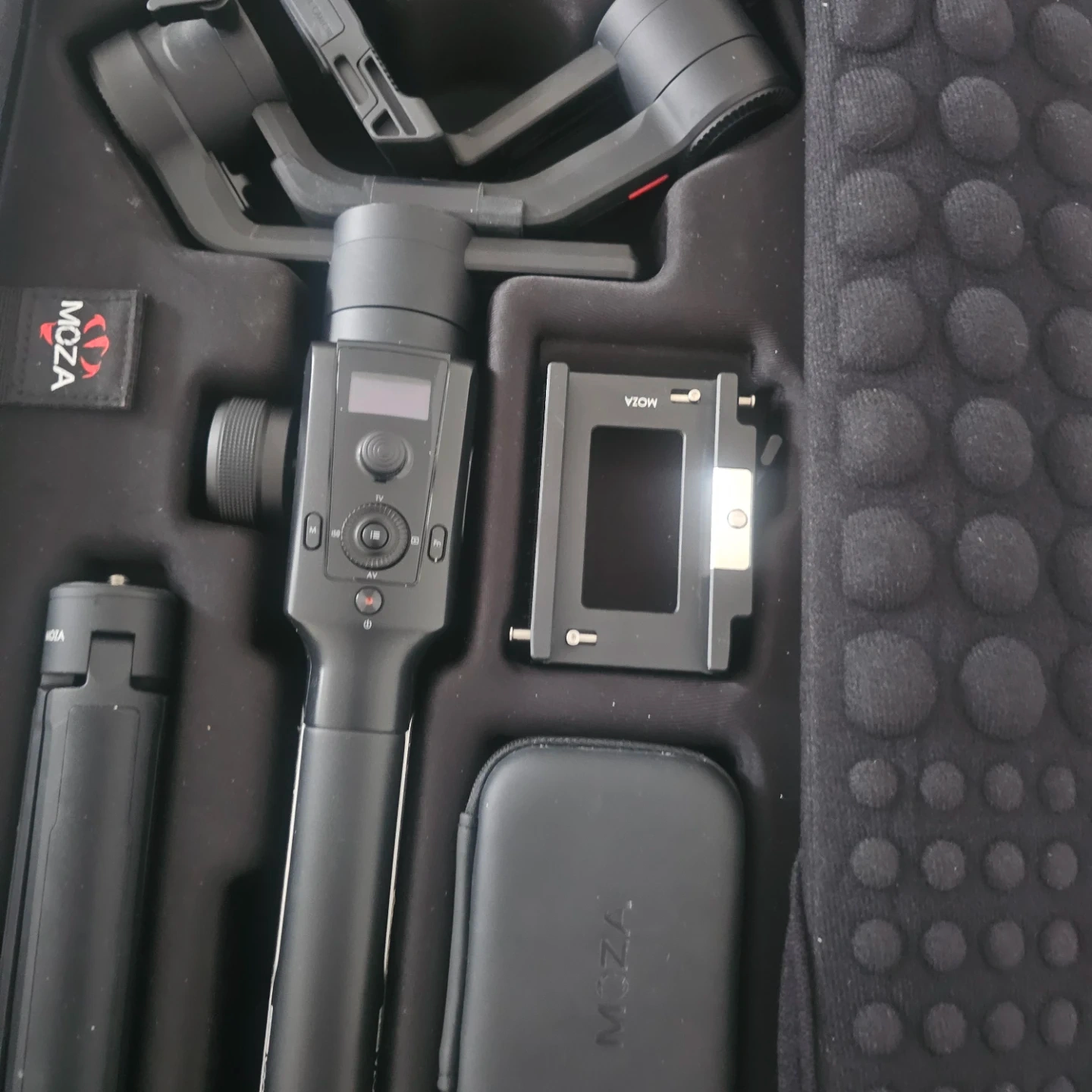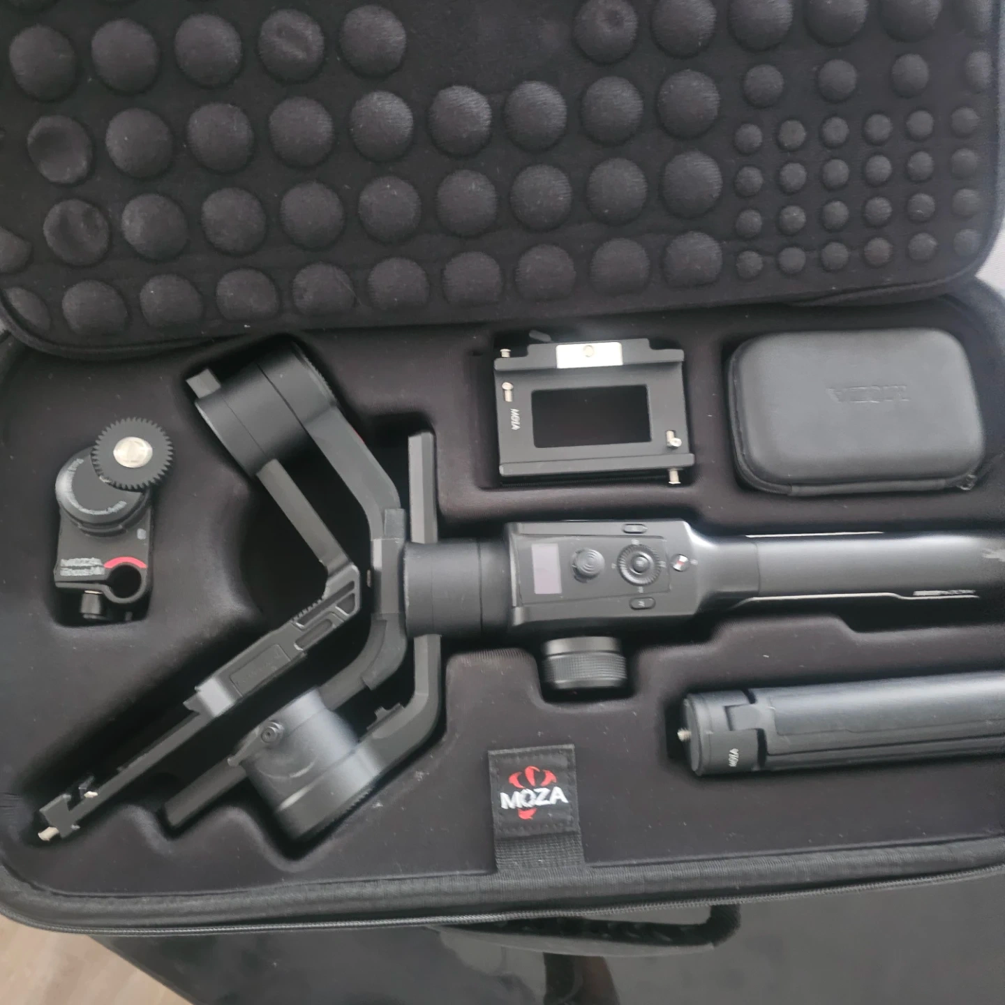 This MOZA Air 2 gimbal stabilizer comes in a protective carrying case. It's designed for professional camera stabilization. Includes various accessories for mounting and operation.