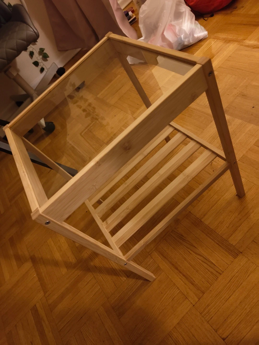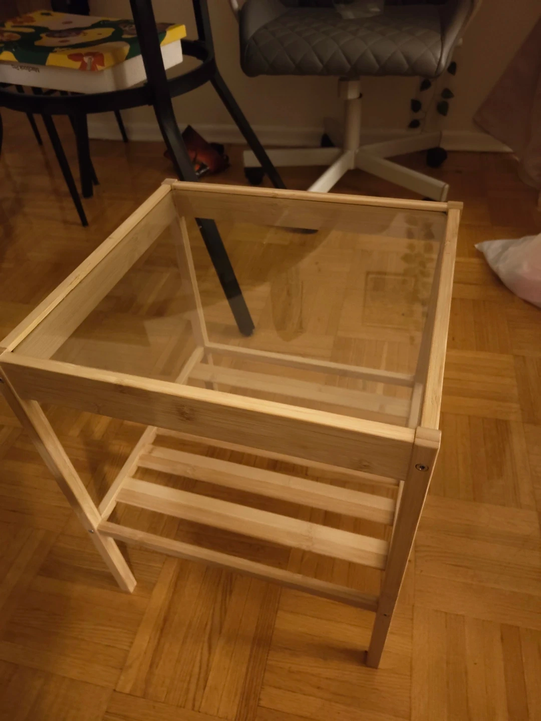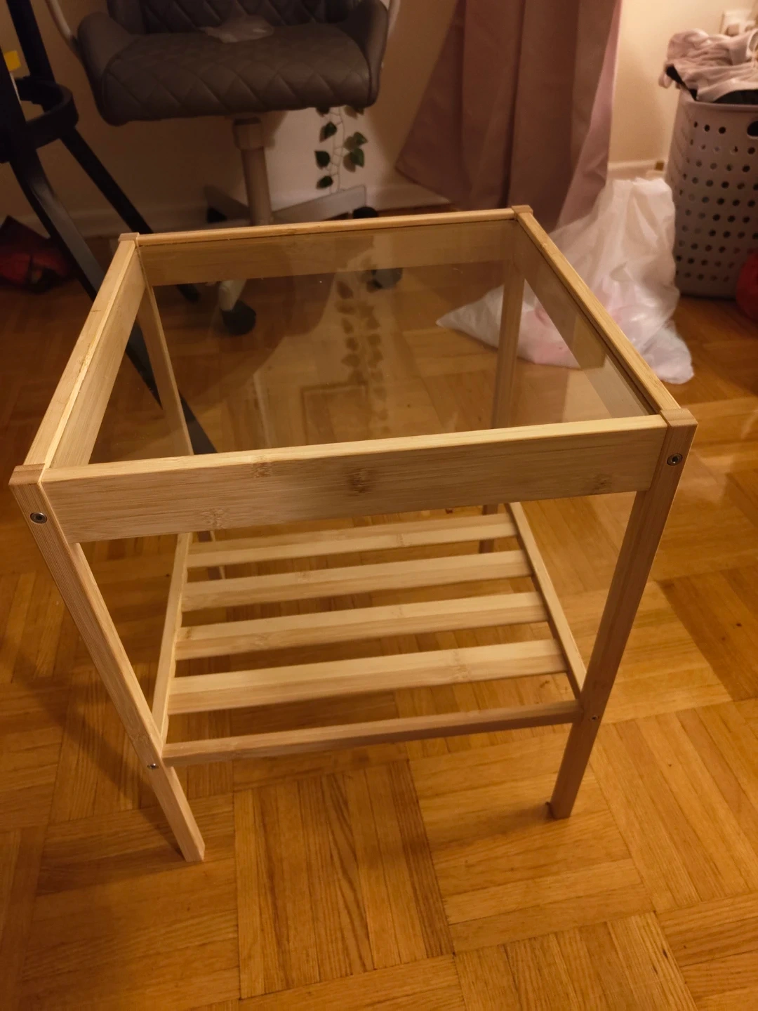 Buy & SellIKEA Wooden Side Table with Glass TopIKEA Wooden Side Table with Glass Top$15A simple side table made from bamboo with a glass top. It has a slatted shelf for extra storage. It's a handy size for placing next to a couch or bed.ConditionNewWHERE TO MEETJarvis and IsabellaView MapSELLERverifiedAMUpper Jarvis1000+117 reviews1 chats·1 favorites·18 viewsSEND CHAT TO SELLERHi AM! I’m interested in your listing.Hi AM! I’m interested in your listing.Get the Karrot app to chatSign In to chat