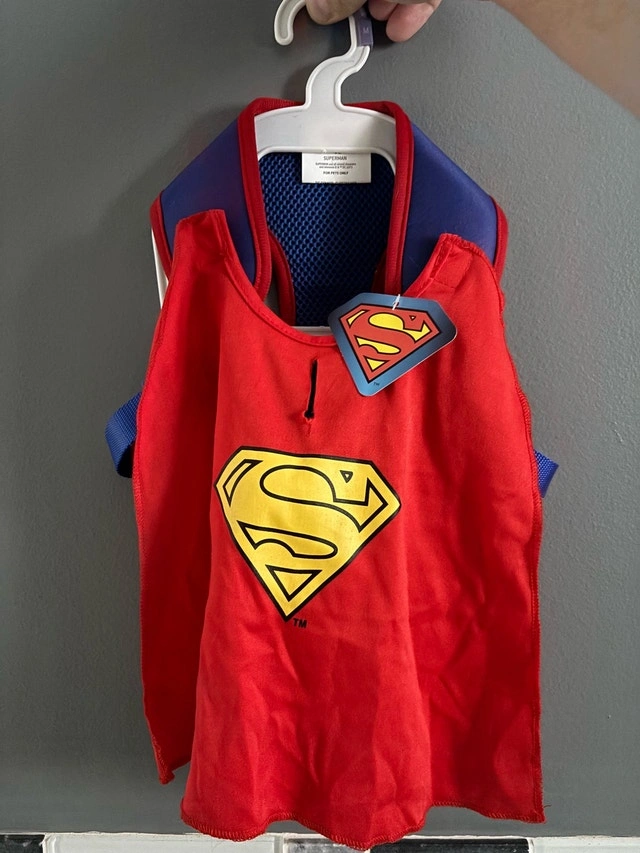 Your furry friend will be ready to save the day with this adorable Superman dog harness! It's in like-new condition, ready for a new super pup. It is adjustable, so it should fit most small to medium sized dogs. Let me know when you'd like to pick it up and let's coordinate a time.