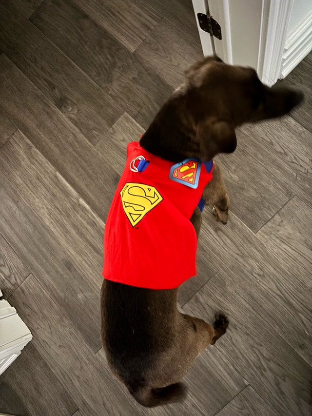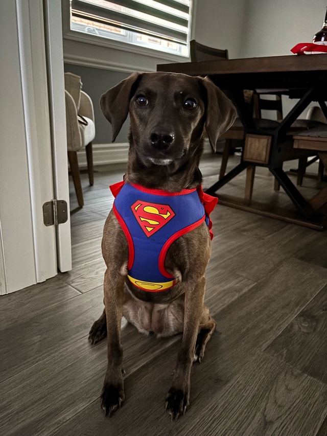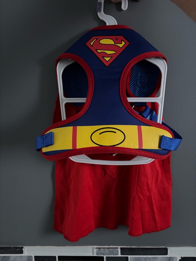 Your furry friend will be ready to save the day with this adorable Superman dog harness! It's in like-new condition, ready for a new super pup. It is adjustable, so it should fit most small to medium sized dogs. Let me know when you'd like to pick it up and let's coordinate a time.