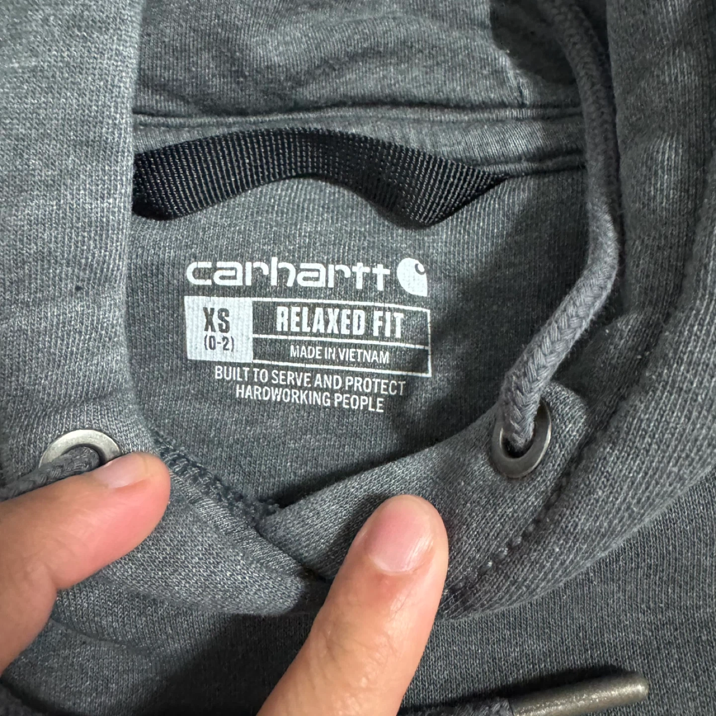 This is a Carhartt relaxed fit hoodie in charcoal grey. It's size XS and made of a soft cotton blend. The hoodie features a front pocket and a drawstring hood. Built to serve and protect hardworking people!