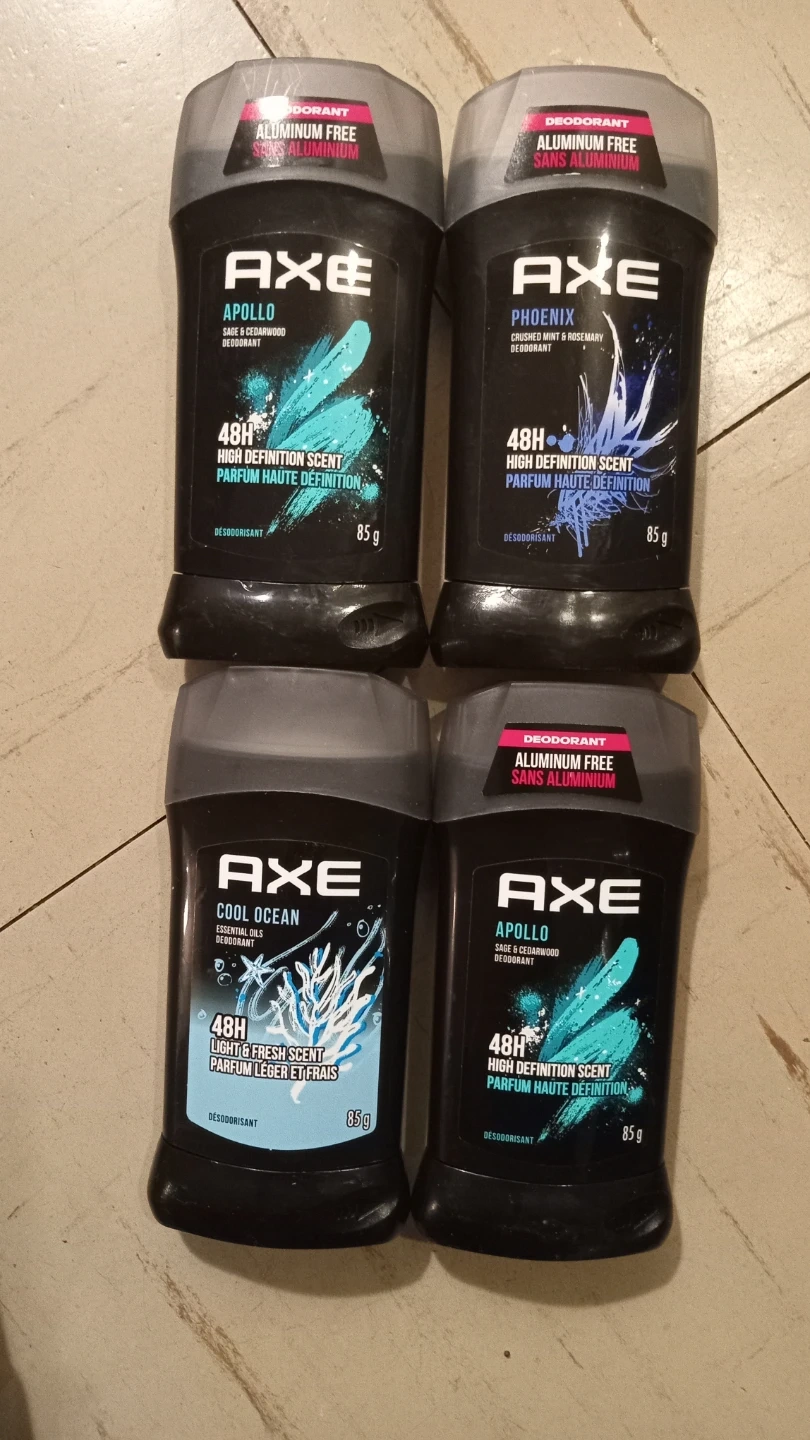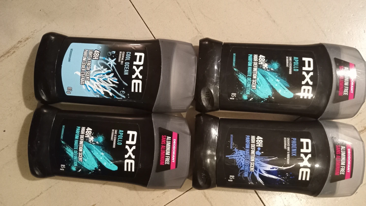 35Selling a lot of four Axe deodorants. The lot includes: - Apollo - Phoenix - Cool Ocean - Apollo Each deodorant is 85g and provides 48-hour high-definition scent protection. All 4 for 10