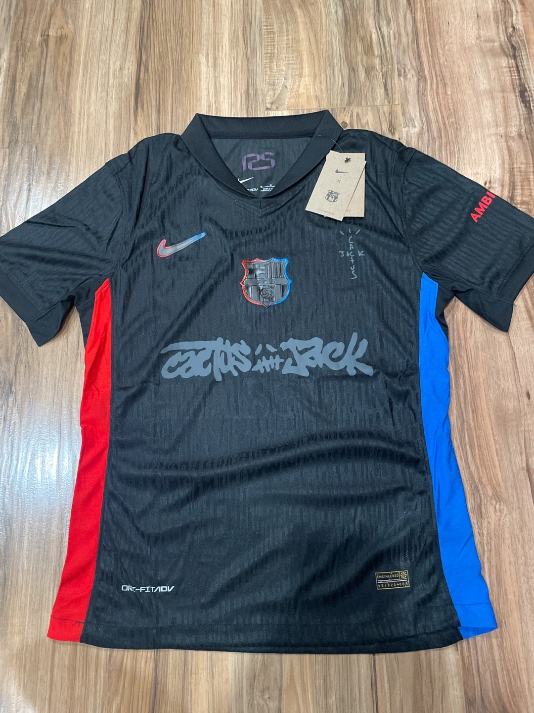 This is a Nike FC Barcelona jersey featuring the Cactus Jack collaboration. It's made with Dry-Fit ADV technology for enhanced comfort and performance. The jersey has a black base with red and blue side panels. Great for any FC Barcelona fan!