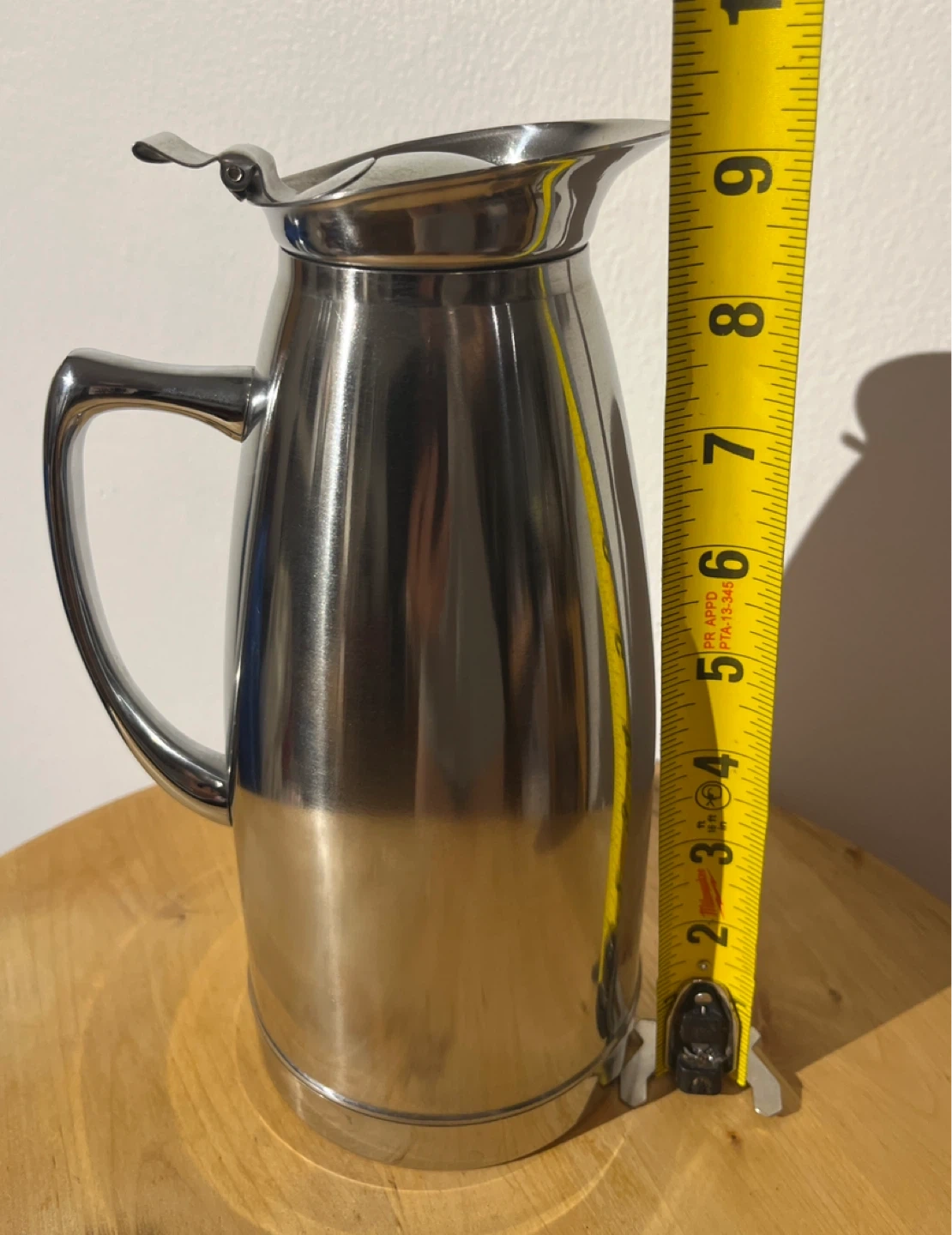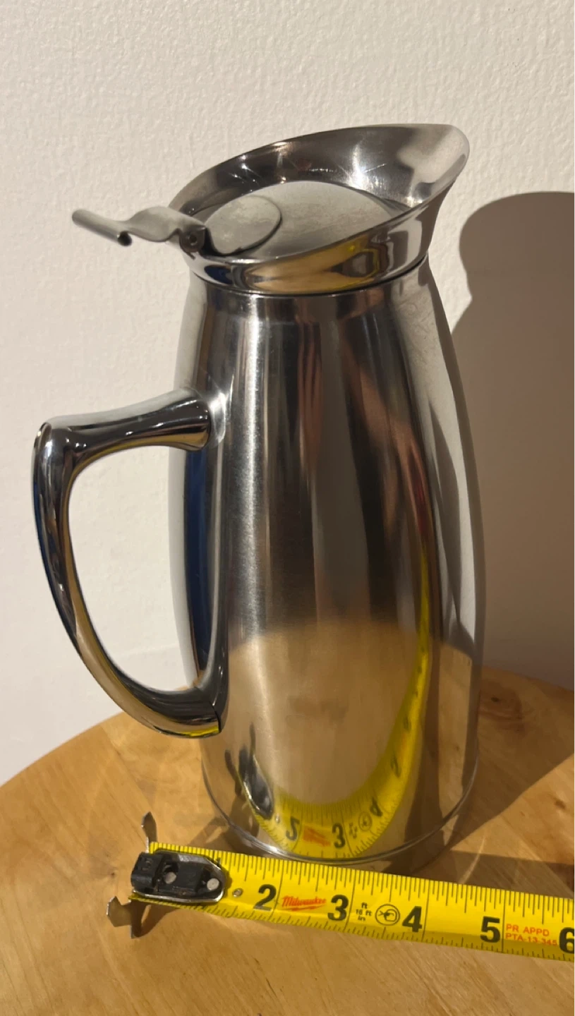 This is a stainless steel thermal carafe pitcher. It has a sleek, durable design. It's great for keeping beverages hot or cold for extended periods. It stands approximately 9 inches tall.