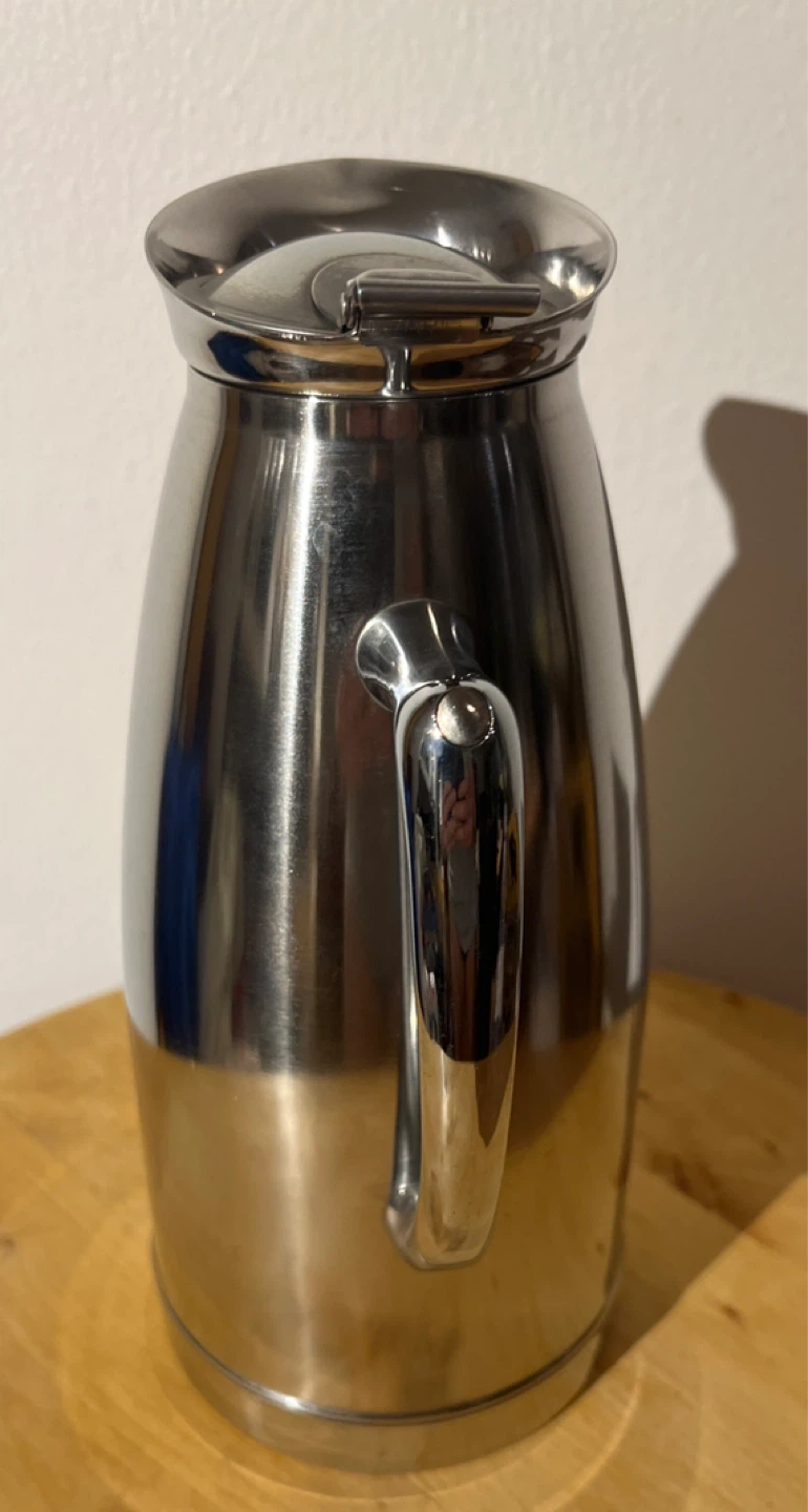 This is a stainless steel thermal carafe pitcher. It has a sleek, durable design. It's great for keeping beverages hot or cold for extended periods. It stands approximately 9 inches tall.