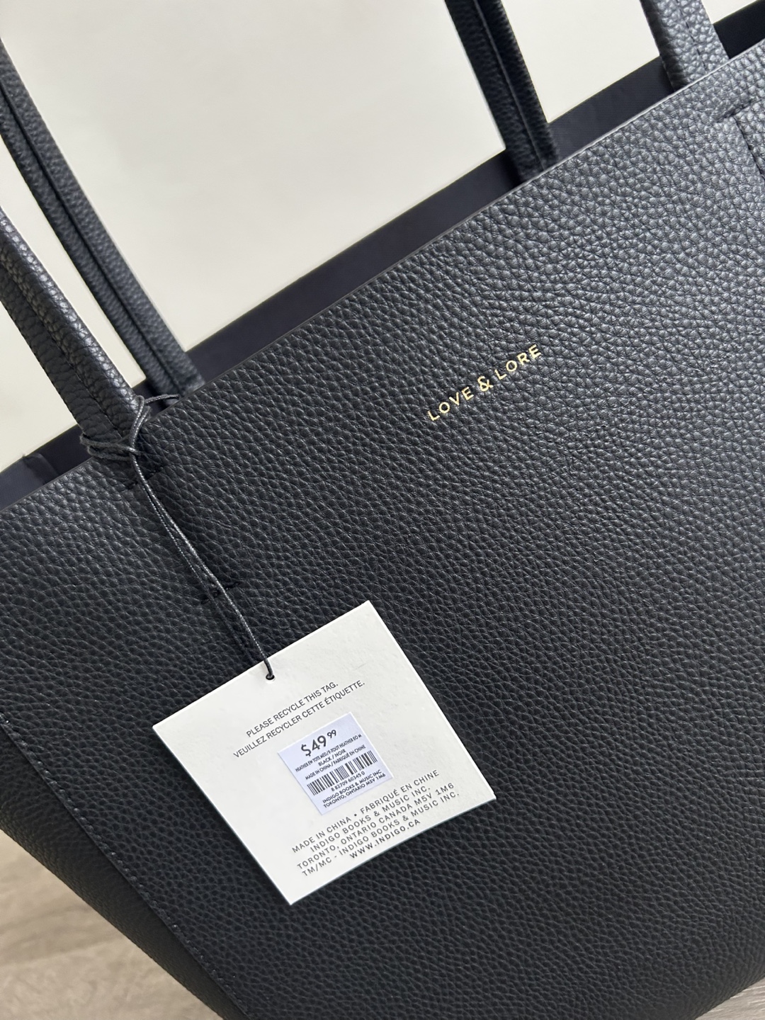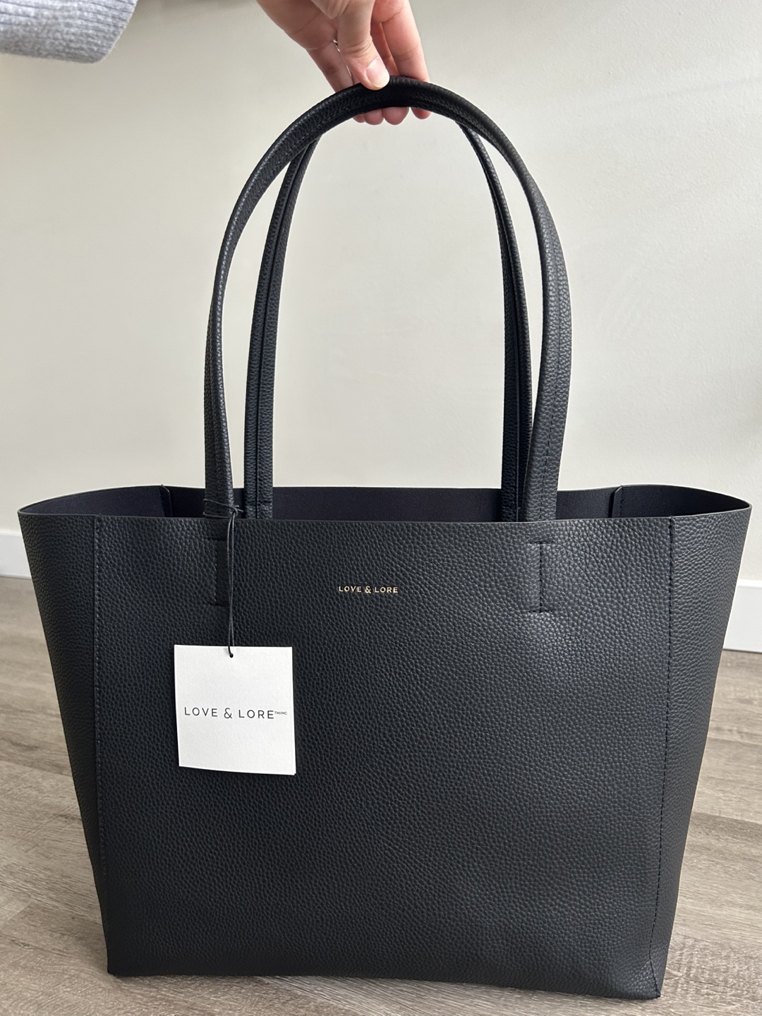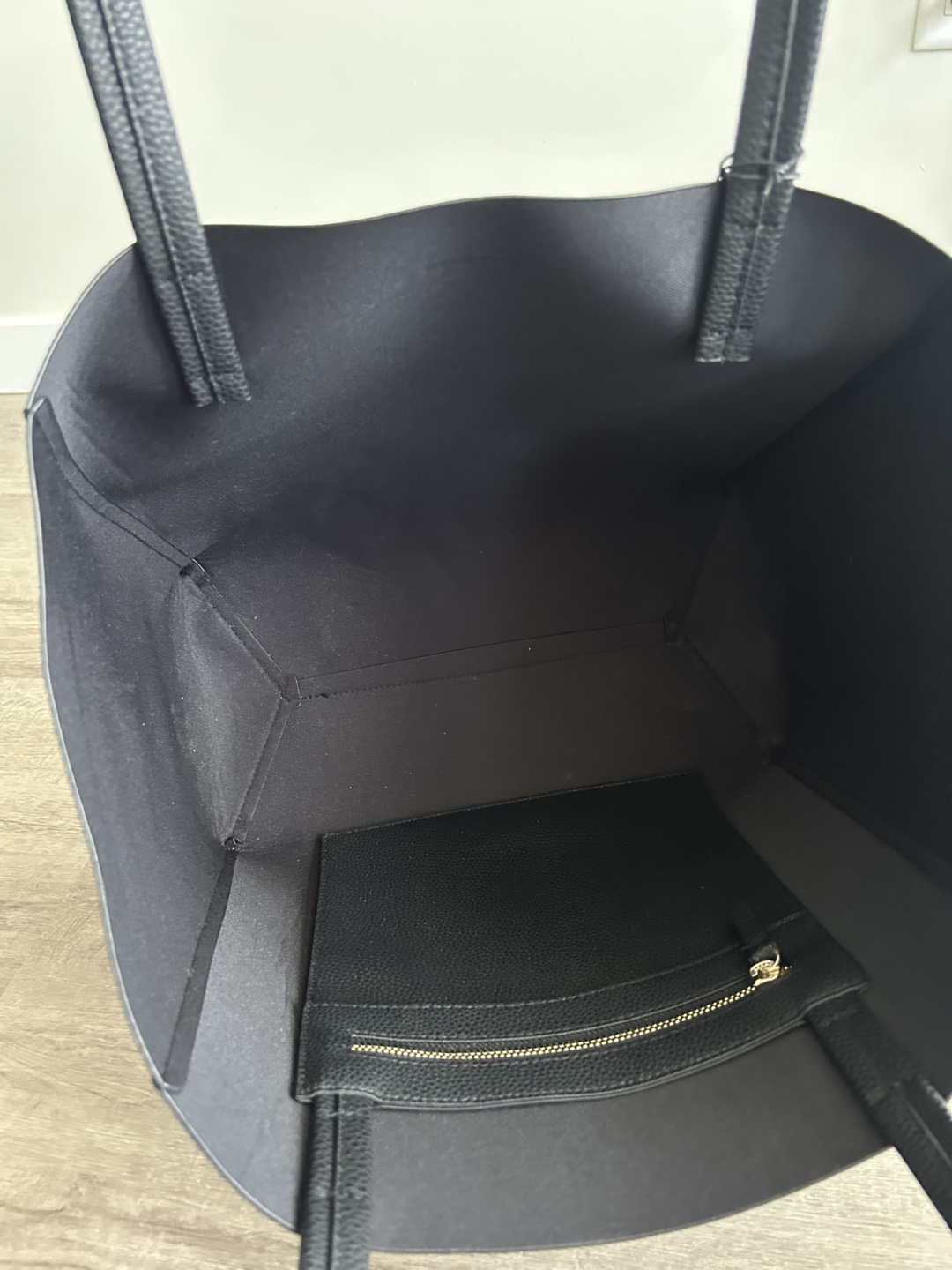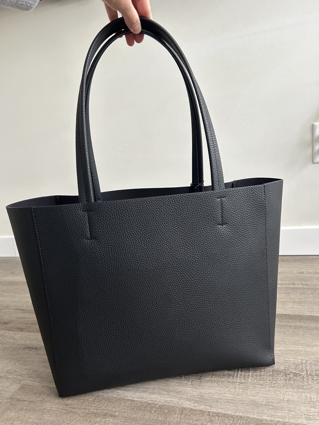 Large black tote bag. Pebbled vegan leather. Two top handles. Interior zip pocket. New with tags.