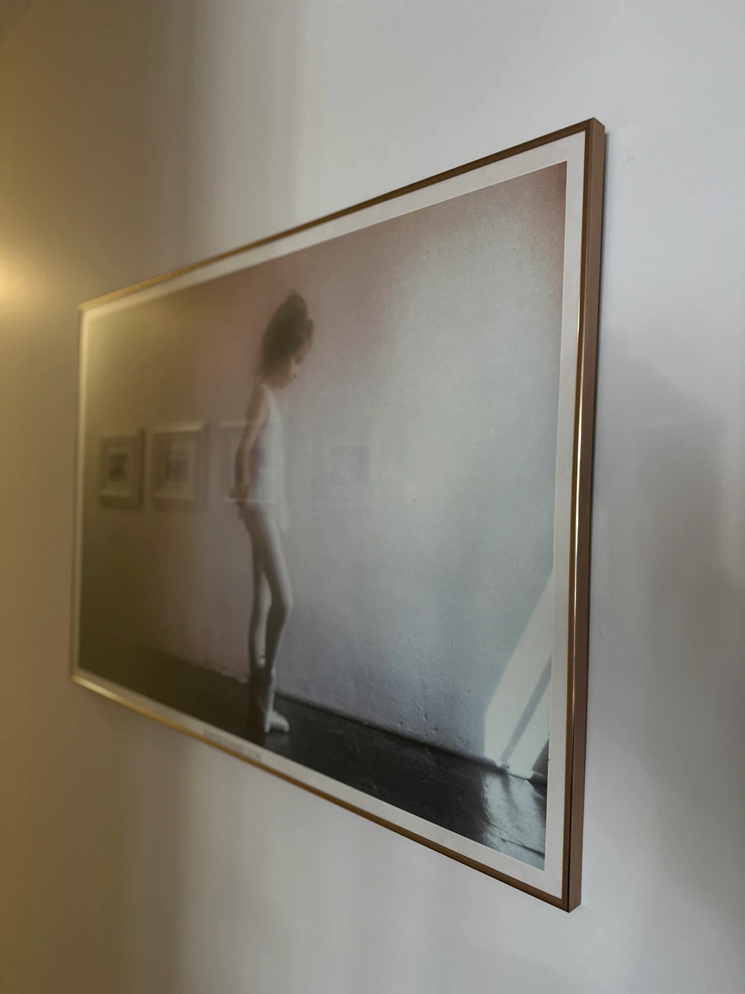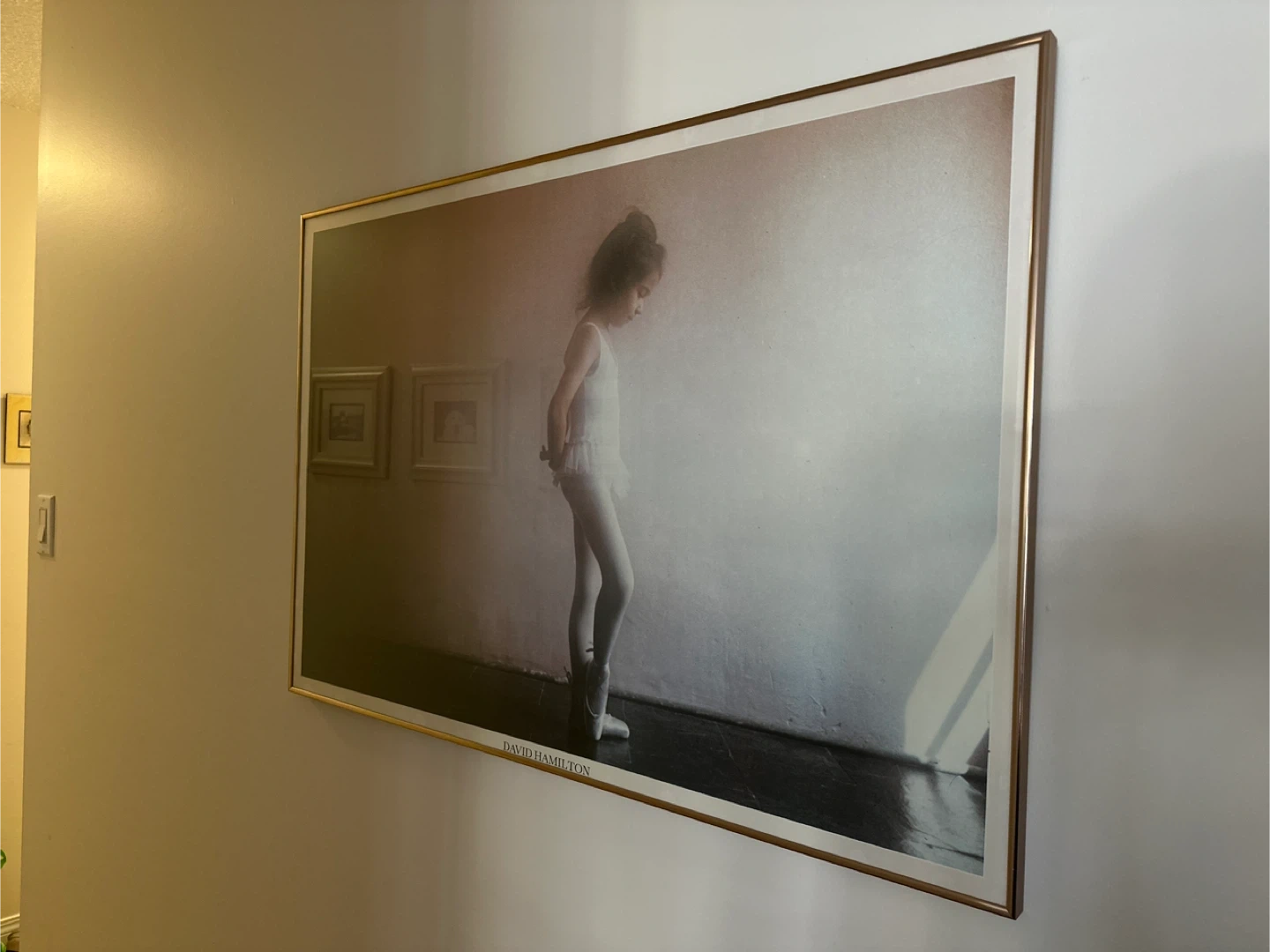 This is a framed print titled "Ballerina" by renowned photographer David Hamilton. It features a young girl in ballet attire, capturing a moment of quiet contemplation. The artwork is presented in a classic gold-toned frame. This piece would add an elegant touch to any room.