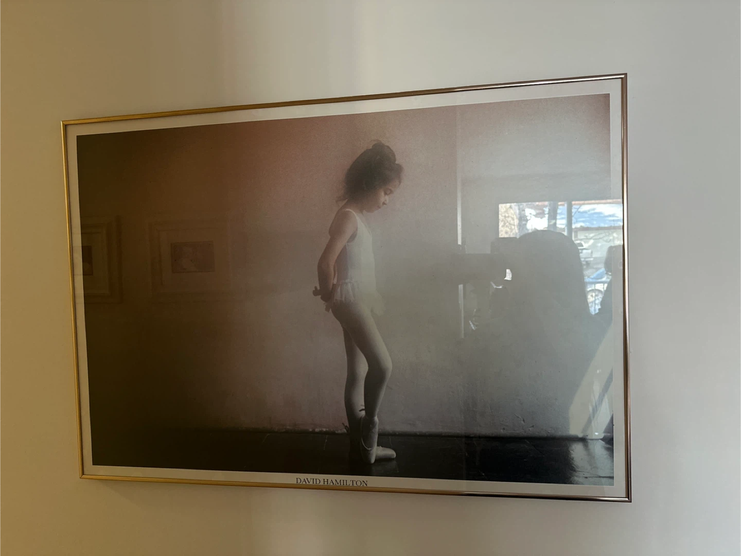 This is a framed print titled "Ballerina" by renowned photographer David Hamilton. It features a young girl in ballet attire, capturing a moment of quiet contemplation. The artwork is presented in a classic gold-toned frame. This piece would add an elegant touch to any room.