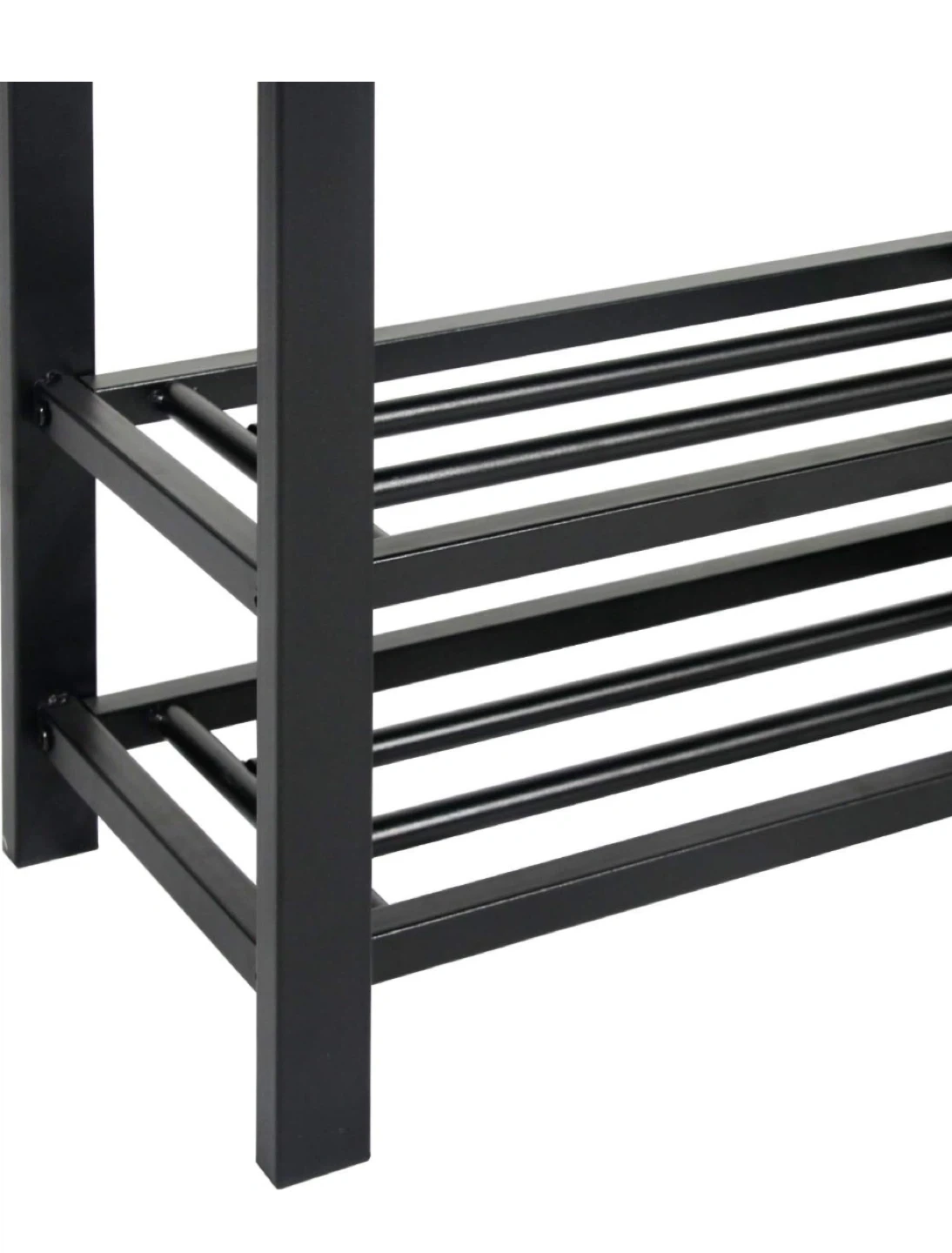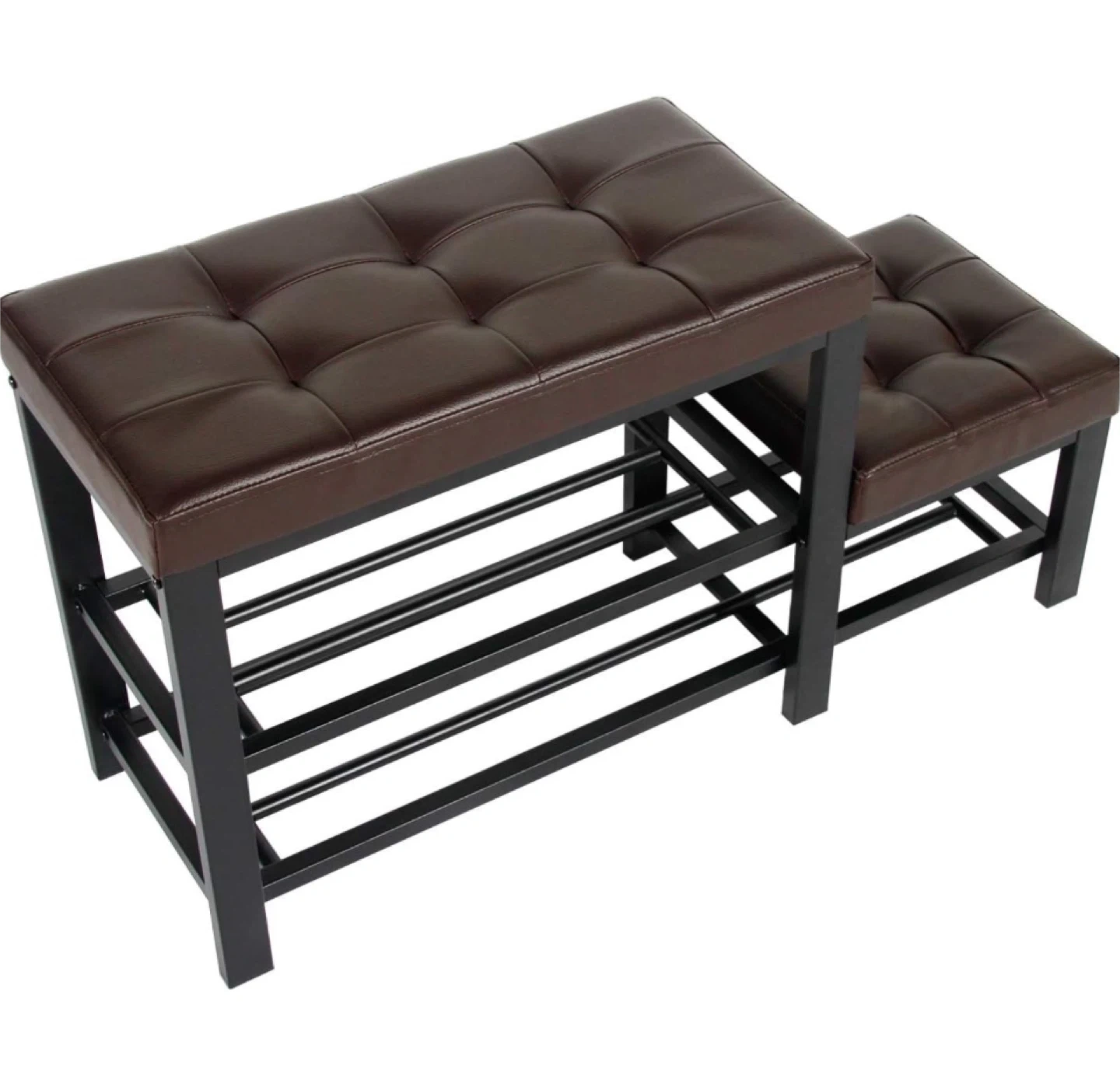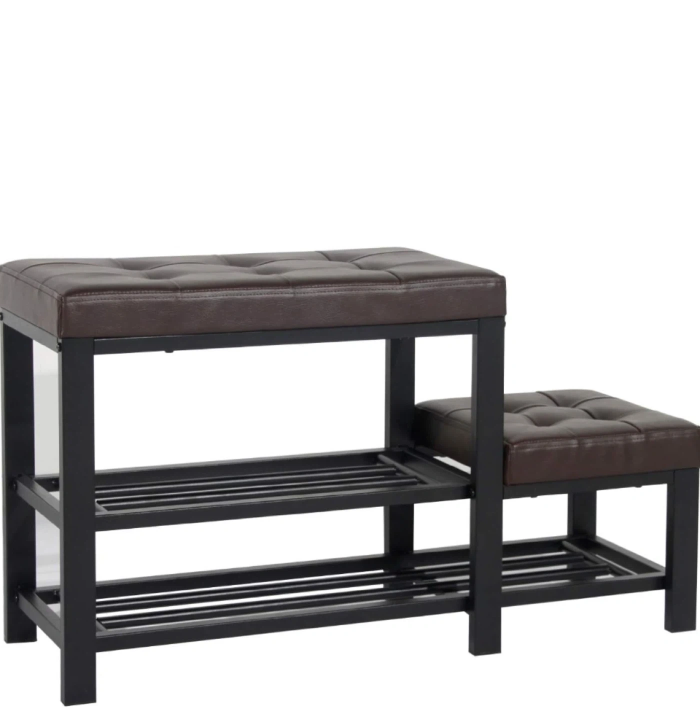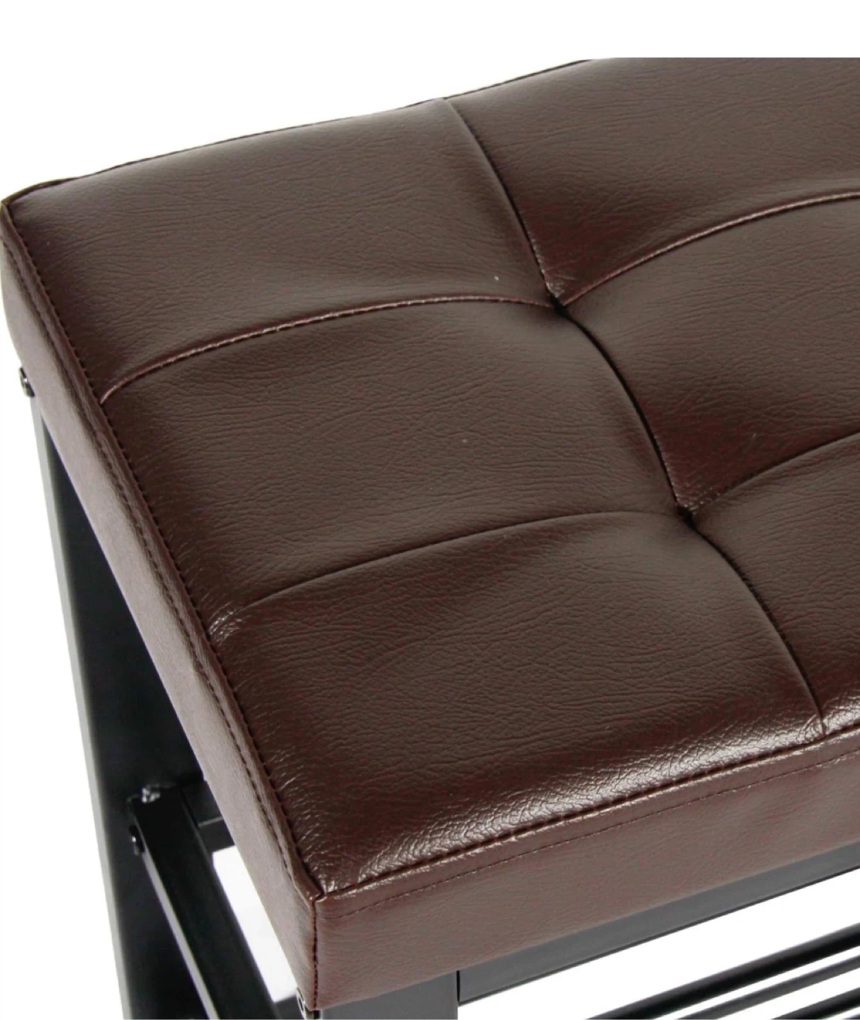This shoe bench features a tufted faux leather top and a black metal frame. It includes two open shelves for shoe storage. Its compact design makes it handy for entryways or mudrooms.