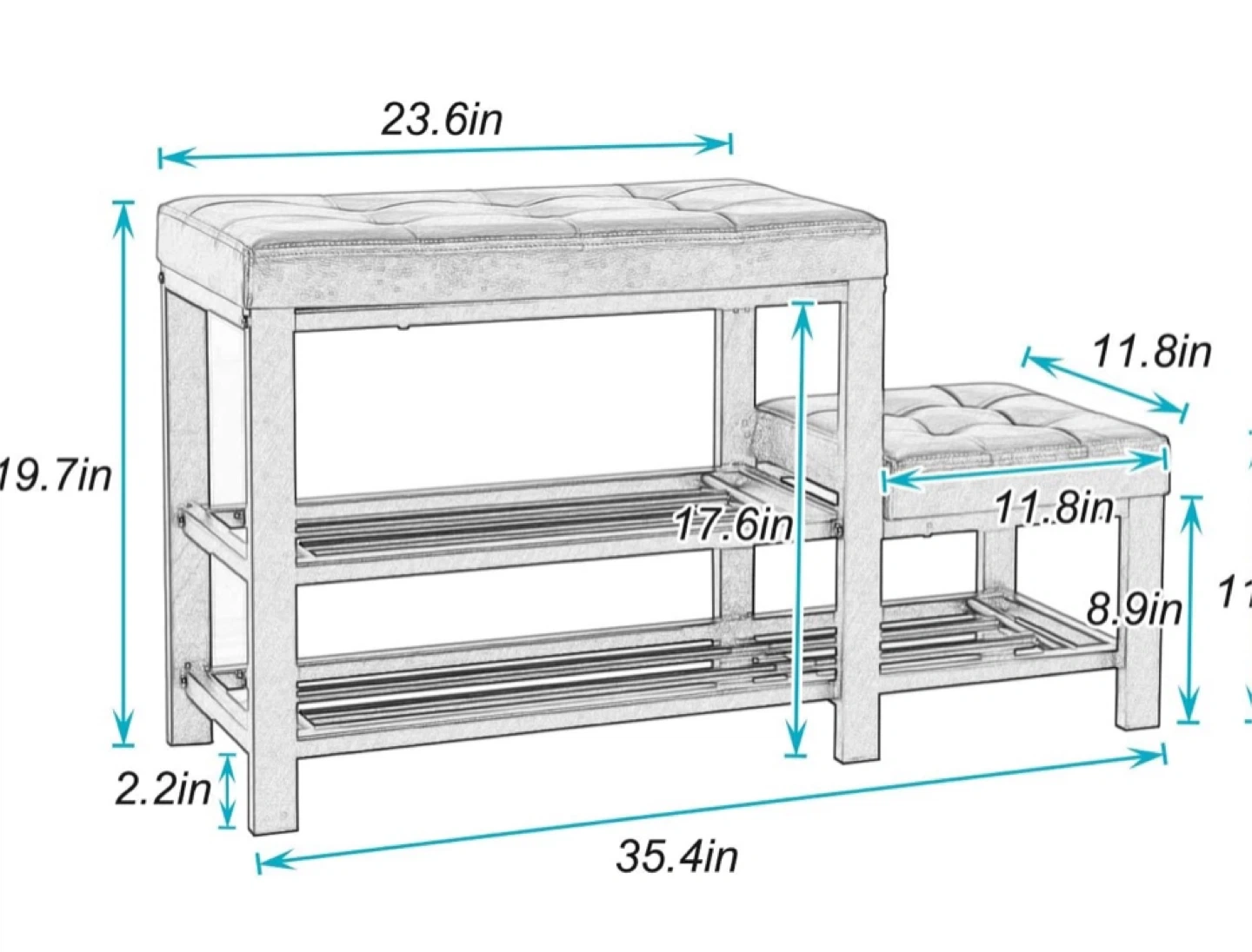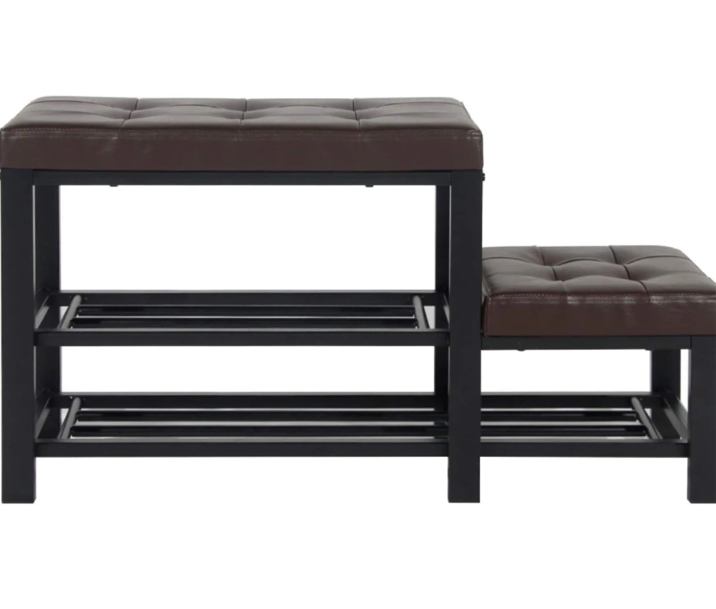 This shoe bench features a tufted faux leather top and a black metal frame. It includes two open shelves for shoe storage. Its compact design makes it handy for entryways or mudrooms.